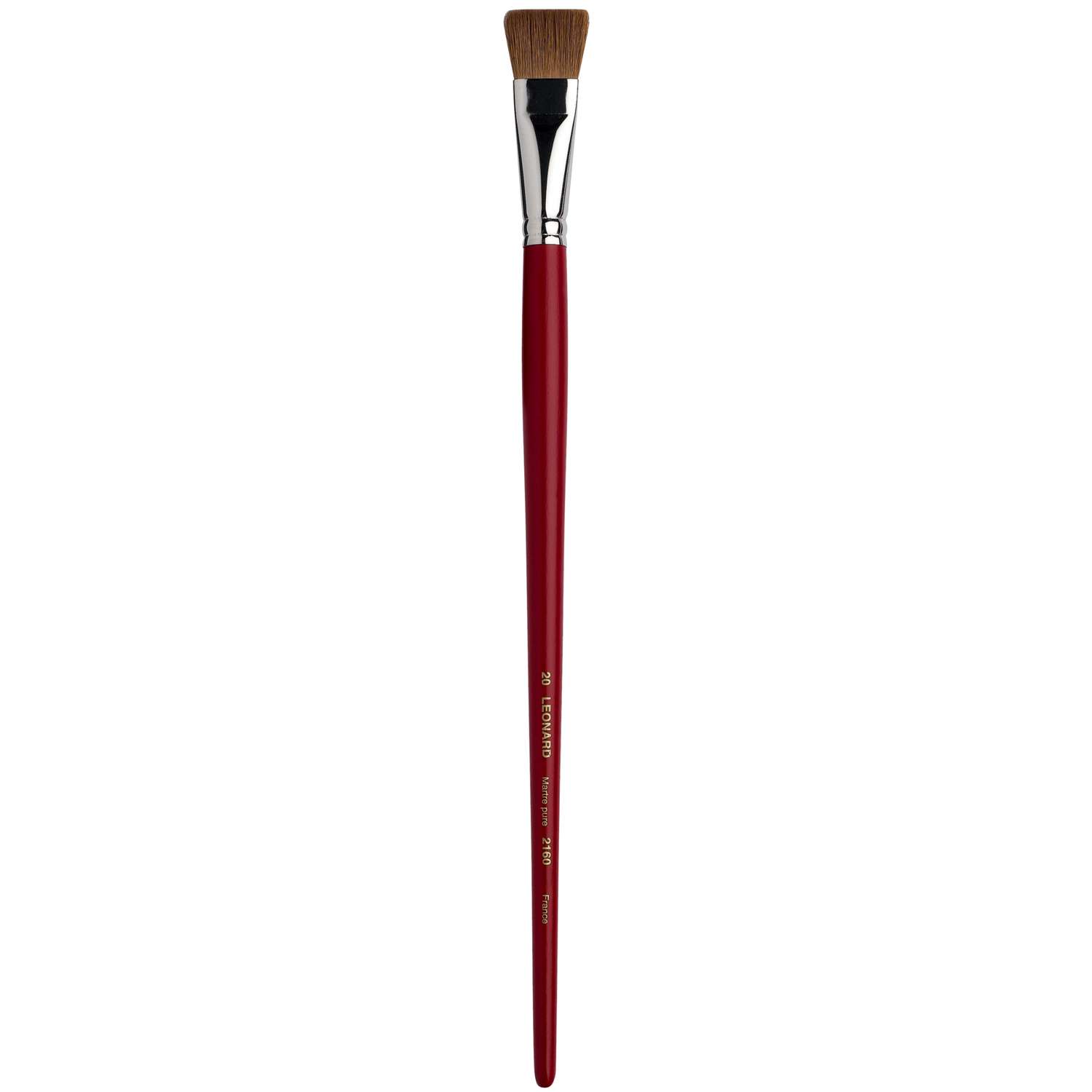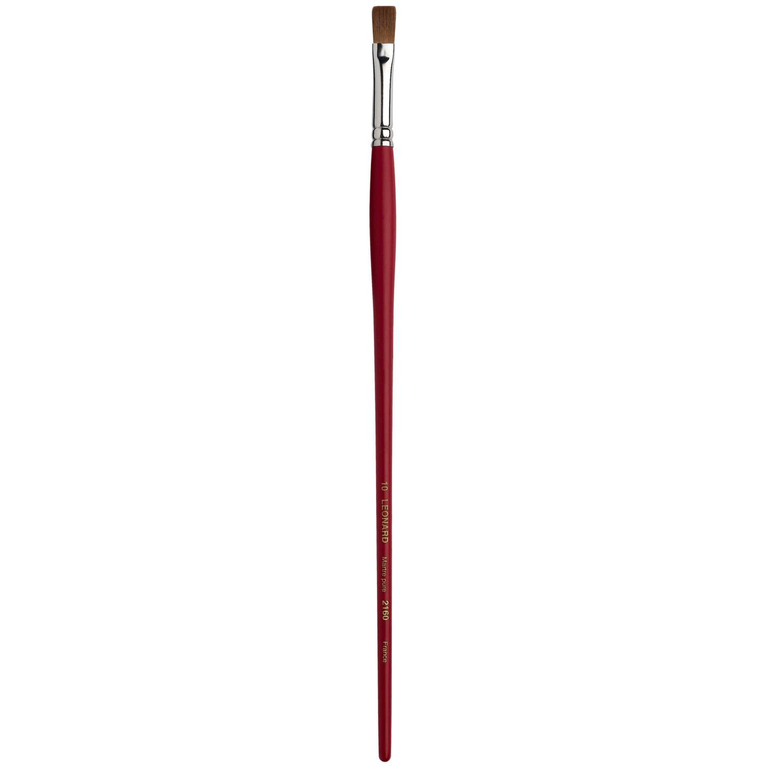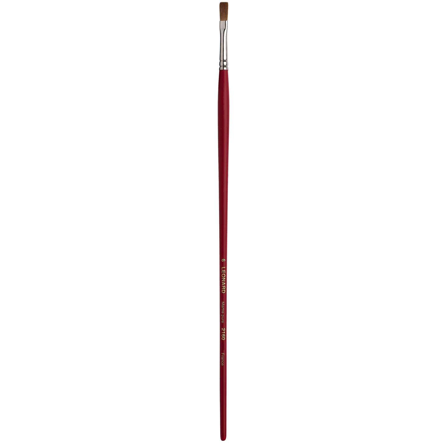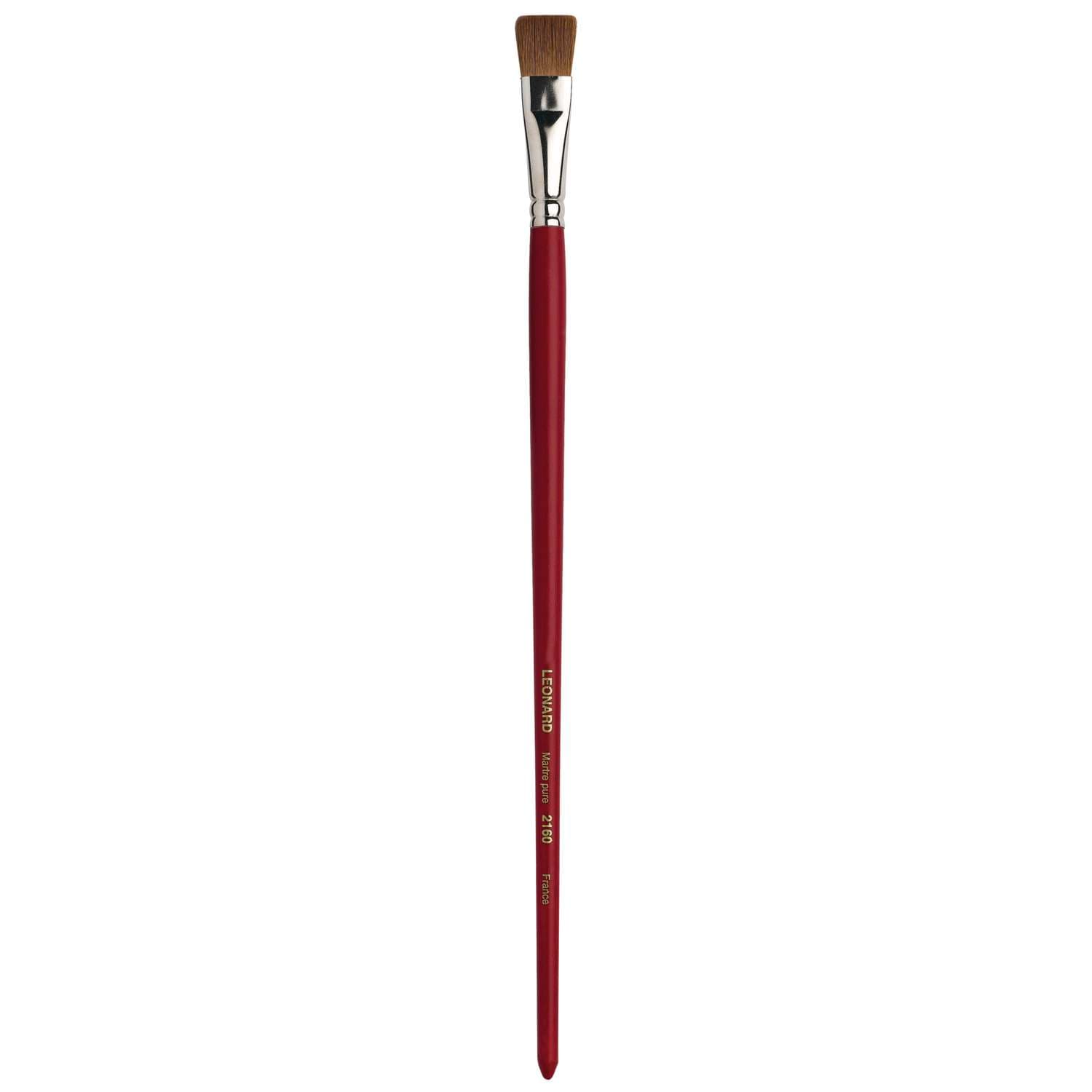 Dünner Flachpinsel mit kurzen Borsten, Rotmarderhaare, Silberzwinge, langer, roter Stiel. Diese Léonard Rotmarderpinsel der Serie 2160 eignen sich für die Öl- und Acrylmalerei. – Preise pro Stück.