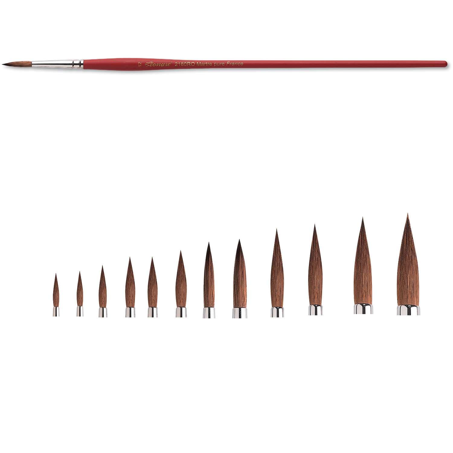 Léonard Rotmarderpinsel, Serie 2160RO, Rundpinsel aus reinen Rotmarderhaaren, nahtlose Silberzwinge, langer matt rot lackierter Stiel. Diese Pinsel eignen sich besonders für die Öl- und Acrylmalerei, für Konturen, feine Züge und Details.