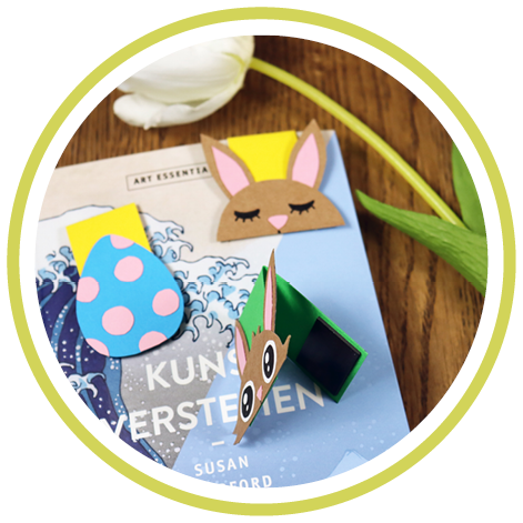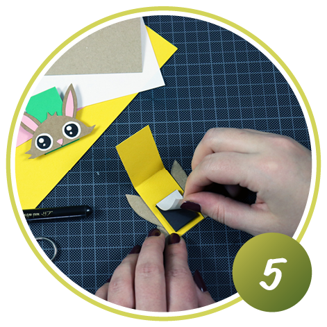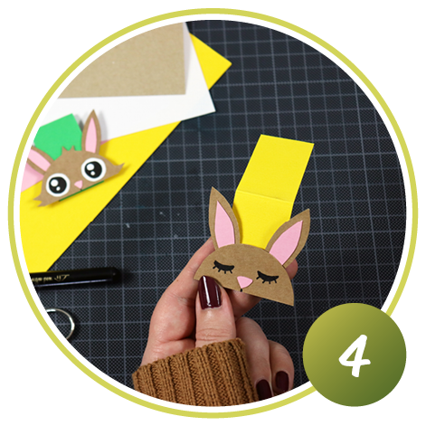 Für die Umschlagsklappe schneiden Sie einen Streifen (ca. 3 x 10 cm) aus grünem Fotokarton aus. Falten Sie diesen in der Mitte und kleben Sie den Hasenkopf an das eine Ende des Streifens.
