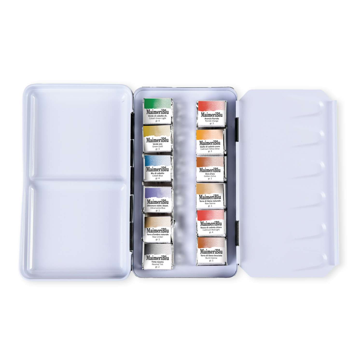 Der MaimeriBlu Aquarellkasten enthält 12 halbe Näpfchen