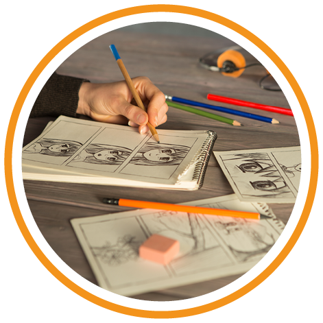 Um seine Figuren und Geschichten zu realisieren, wird eine Vorskizze mit Bleistift angelegt.