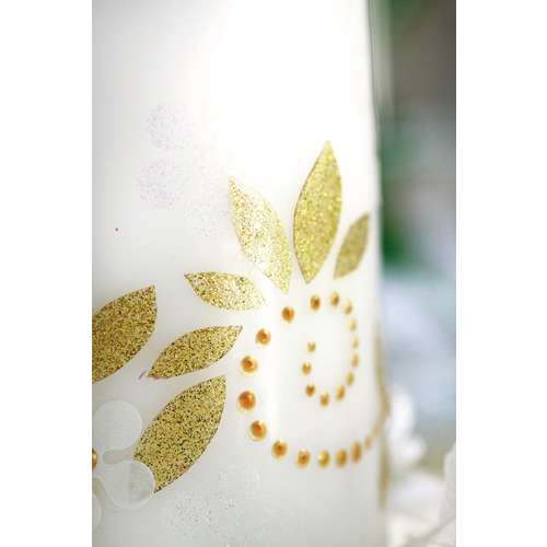 4. Schablonieren - Fixieren Sie eine Schablone direkt auf der Kerze und tragen Sie anschließend mit einem Schwämmchen die Wachsmalfarbe auf.