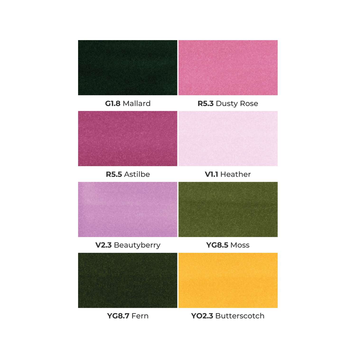 - Botannical: G1.8 Mallard, R5.3 Dusty rose, R5.5 Astilbe, V1.1 Heather, V2.3 Beautyberry, YG8.5 Moss, YG8.7 Fern, YO2.3 Butterscotch