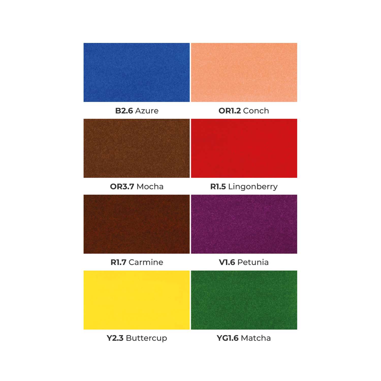 - Comic: B2.6 Azure, OR1.2 Conch, OR3.7 Mocha, R1.5 Lingonberry, R1.7 Carmine, V1.6 Petunia, Y2.3 Buttercup, YG1.6 Matcha
