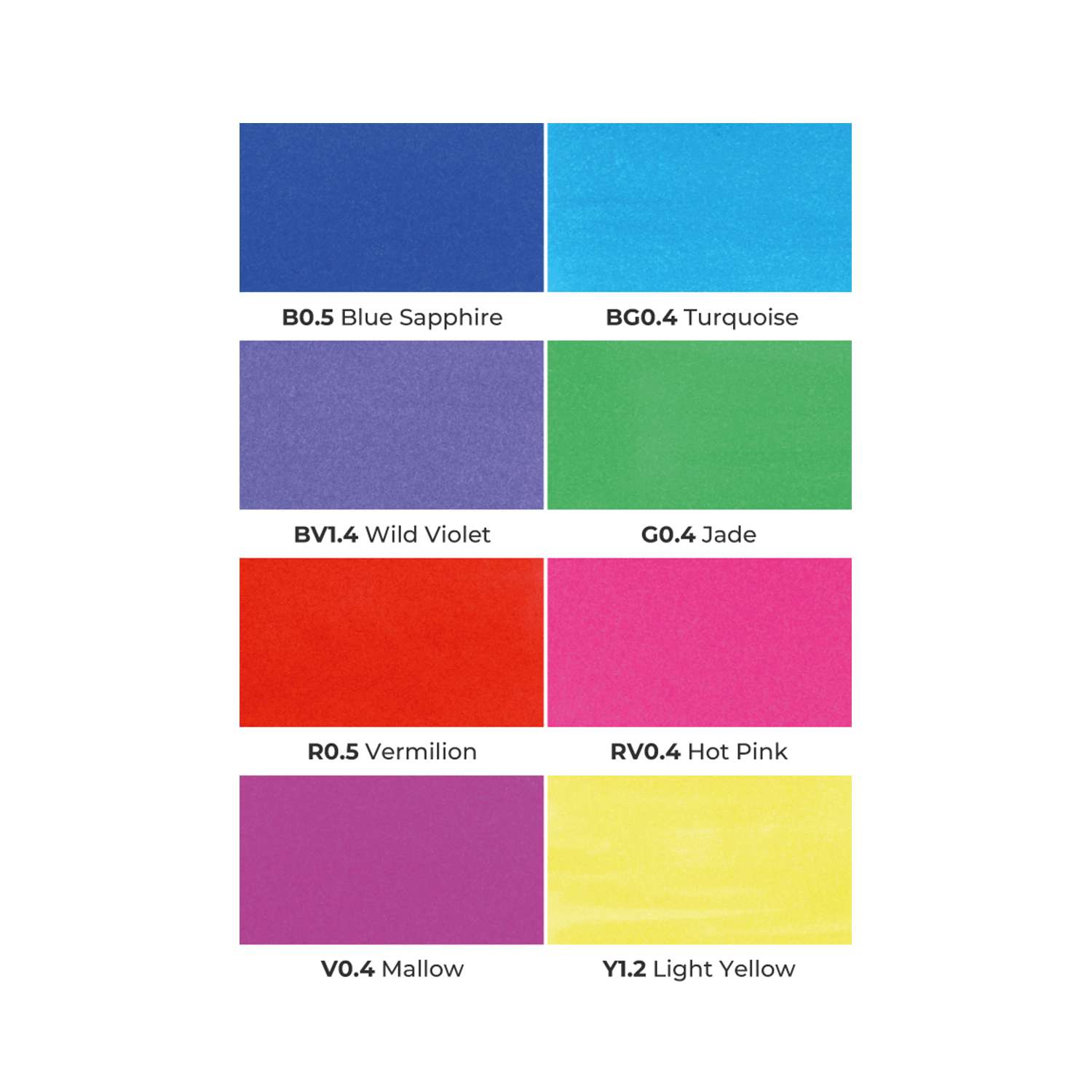 - Vibrant: B0.5 Blue sapphire, BG0.4 Turquoise, BV1.4 Wild violet, G0.4 Jade, R0.5 Vermilion, RV0.4 Hot pink, V0.4 Mallow, Y1.2 Light yellow