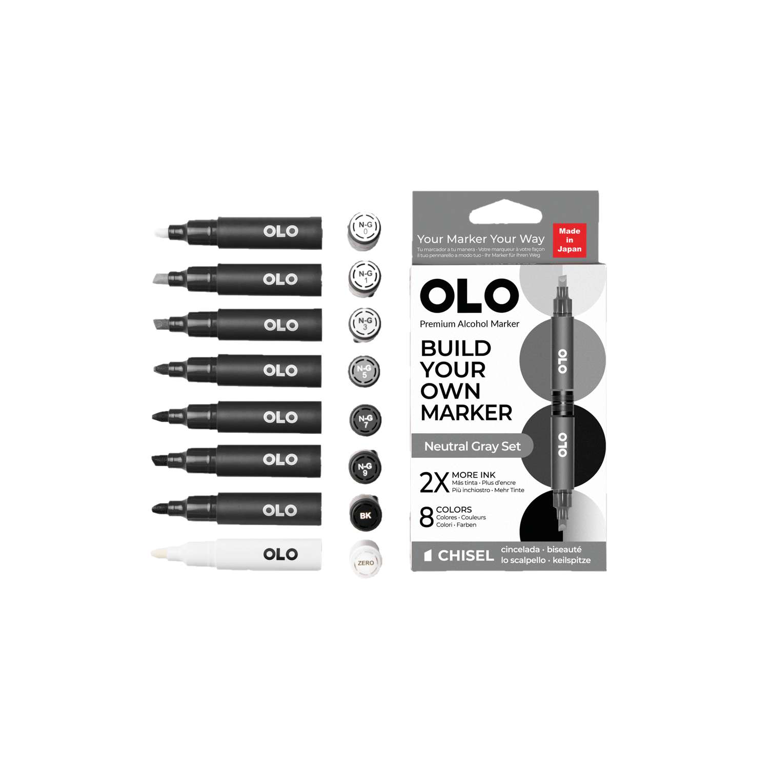 Der Marker-Körper von OLO™ ist so gestaltet, dass die Spitze leicht und schnell identifiziert werden kann. Der dunkelgraue für die Keilspitze und der weiße Marker-Körper für den ZERO-Marker (farblose Lösung).