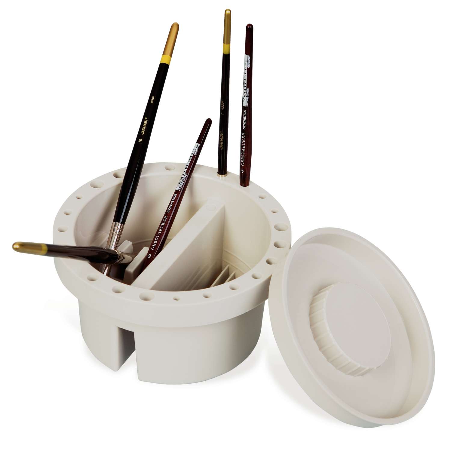 Vielseitig einsetzbarer Pinselwascher aus unempfindlichem, lösungsmittelbeständigen Kunststoff. Das praktische 3-Kammersystem mit Aussparungen, erleichtert Ihnen Pinsel während und nach dem Malen zu halten und ihre Spitzen schonend im Wasser aufzubewahren. Ebenso besitzt der Pinselwascher eine Kammer mit Lamellen auf dem Boden zur Erleichterung des Reinigens. Ø 17 cm, Höhe 8,5 cm. (Lieferung ohne Pinsel).