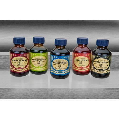 ROHRER's Antiktusche ist eine hochpigmentierte Tusche mit guter bis sehr guter Lichtechtheit. Die Farbtöne vereinen gute Benetzung, hohe Randschärfe und eine gute Tuschabgabe bei einer optimal eingestellten Trockenzeit. Dies lässt den Einsatz von speziellen Tuschefüllern (z. B. ArtPent von rotring, Best.-Nr. 30601) und natürlich allen anderen für die Kalligrafie in Frage kommenden Schreibgeräten zu. Außerdem ist ROHRER's Antiktusche auch für die Verarbeitung mit Spritzpistolen (Airbrush) bestens geeignet. Als Maluntergrund eignen sich Zeichenpapier, Zeichenkarton, Transparentpapier und mattierte Polyesterfolien. Für die Kalligrafie kommen auch stärker saugende Untergründe, wie Ingres-Bütten oder Aquarellpapier in Frage. Durch das eingesetzte Acrylharz-Bindemittel trocknen die Tuschen wisch- und wasserfest auf. Der Verzicht auf ein Netzmittel sorgt für einen optimalen Fluss, ohne dass die Tuschen verlaufen und in das Papier einschlagen. Alle 18 Farbtöne sind untereinander mischbar. Auch eine Kombination mit ROHRER's Zeichentusche ist möglich, wodurch sich zum Beispiel in Verbindung mit Gold und Silber interessante Metalliceffekte erzielen lassen. Erhältlich in der 100-ml-Flasche. – Preis pro Flasche.