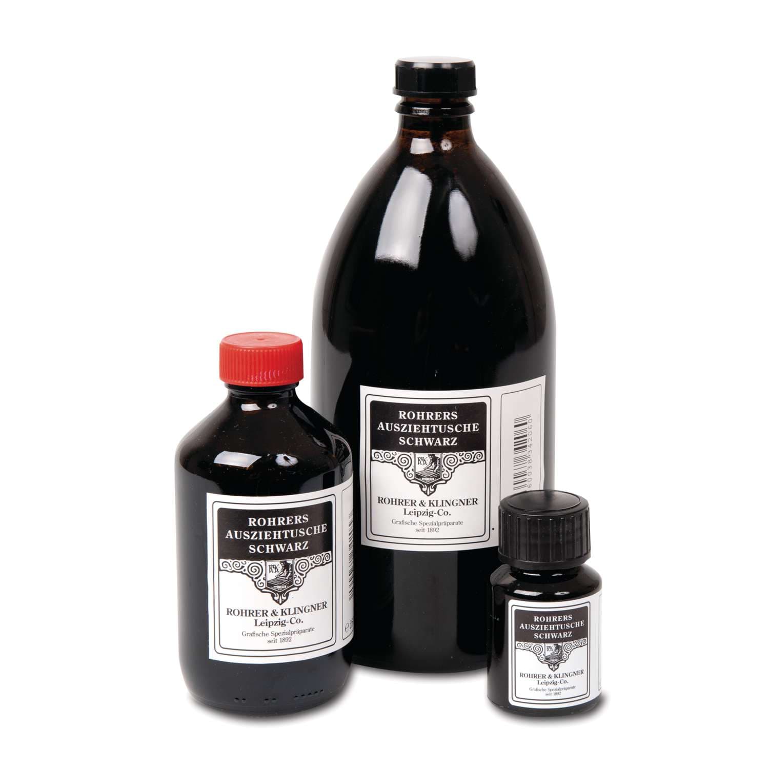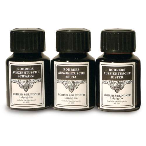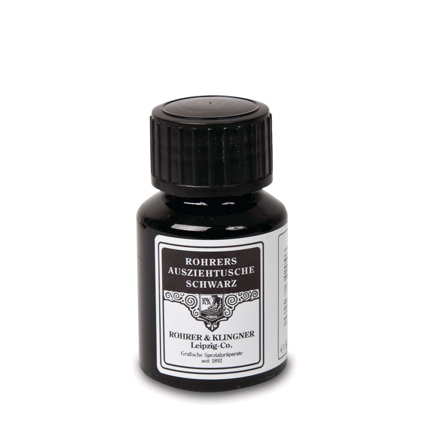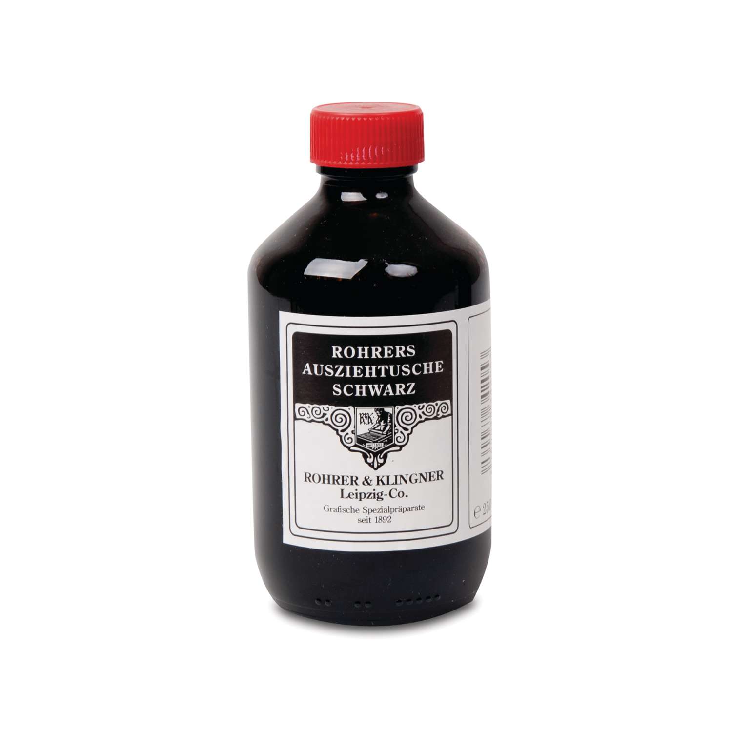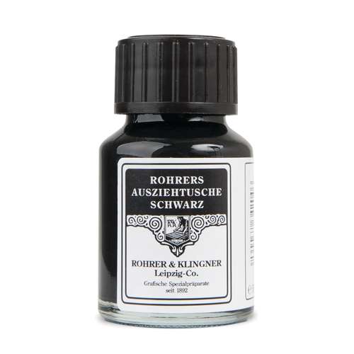 ROHRER & KLINGNER Ausziehtusche Schwarz, ist universell in ihrem Anwendungsbereich und eignet sich sowohl für feine kalligrafische Arbeiten und Federzeichnungen als auch für Absprengtechnik und malerische Pinselzeichnungen. Sie ist unverdünnt deckend tiefschwarz, lässt sich aber auch mit destilliertem Wasser zu Grautönen verdünnen. Die Ausziehtusche