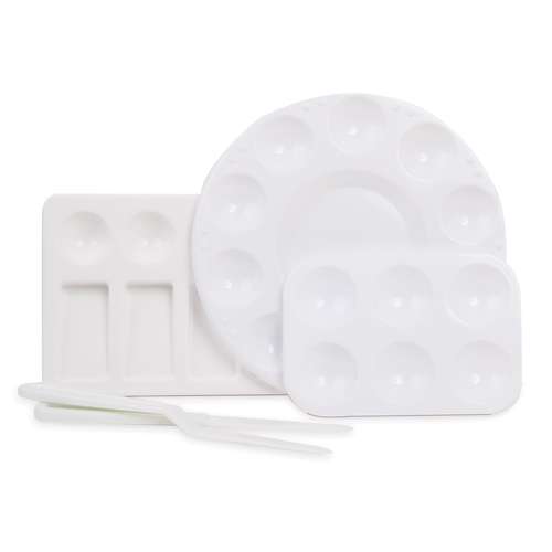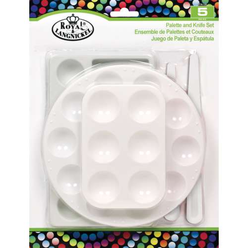 3 Mischpaletten und 2 Malmessern aus weißem Kunststoff im Royal & Langnickel Paletten und Malmesser Set. Praktisch, handlich und robust. Ideal für Aquarell-, Tempera und Acrylmalerei.
