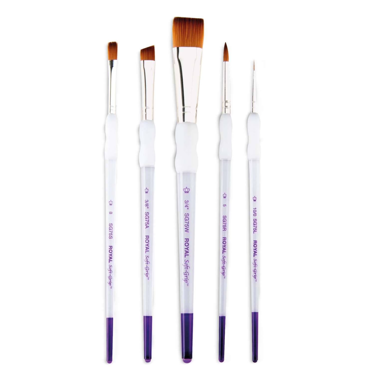 Das Royal & Langnickel Soft-Grip Set enthält 5 Synthetik-Rotmarder-Pinsel mit unterschiedlichen Pinselkopfformen. Die Pinsel verfügen über ergonomisch geformten Stiele mit patentierter Soft-Grip-Griffzone aus weichem Anti-Rutsch-Gummi für besonderen Malkomfort.