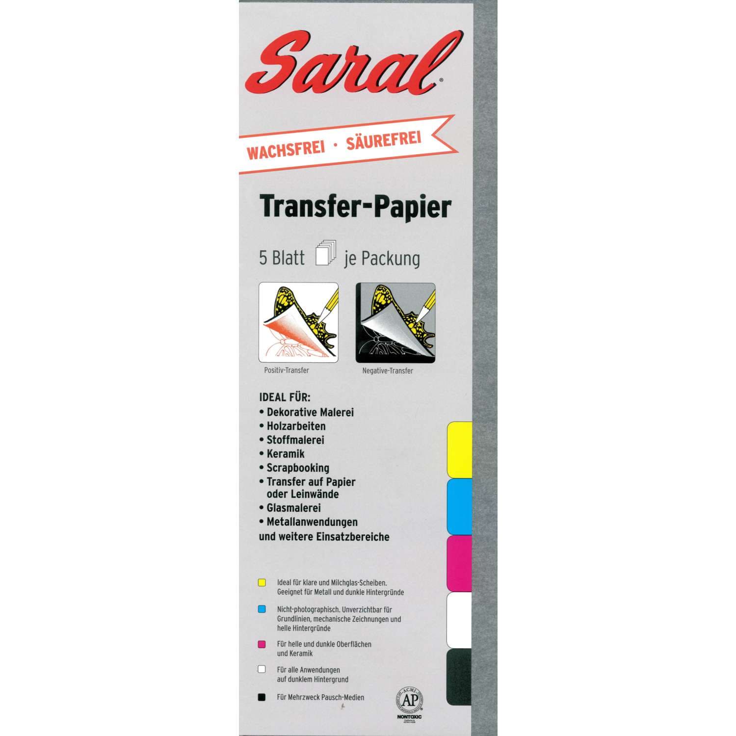 Das Transfer-Papier von Saral® lässt sich überall verwenden wo es darum geht, eine Zeichnung von einem Muster, einer Skizze oder einer Vorlage auf eine beliebige Oberfläche zu übertragen. Saral® Transfer-Papier hinterlässt keinen Wachsrückstand, so dass die Nachzieh-Linie wie Bleistift mit einem Radierer ausradiert werden kann. Die Nachziehlinien sind auch aus Stoffen auswaschbar und können von Keramik, Glas, Kacheln und Metalloberflächen abgewischt werden. Die Nachzieh-Linie kann mit Farbe oder Tusche übermalt oder überzeichnet werden. Die einzelnen Bögen können immer wieder verwendet werden. Die unterschiedlichen Farben weisen folgende Besonderheiten auf: