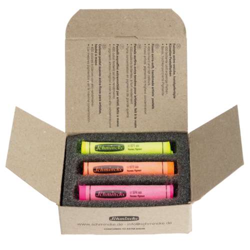 Leuchtende Neonfarben für starke Pastelleffekte. Das Kartonset enthält drei extra-weiche SCHMINCKE Künstler-Pastelle und eignet sich ideal zum Kennenlernen der außergewöhnlichen Farbintensität dieser handgefertigten Pastellkreiden. Dank der hohen Pigmentkonzentration und des minimalen Bindemittelanteils entstehen besonders satte, brillante Farbergebnisse.