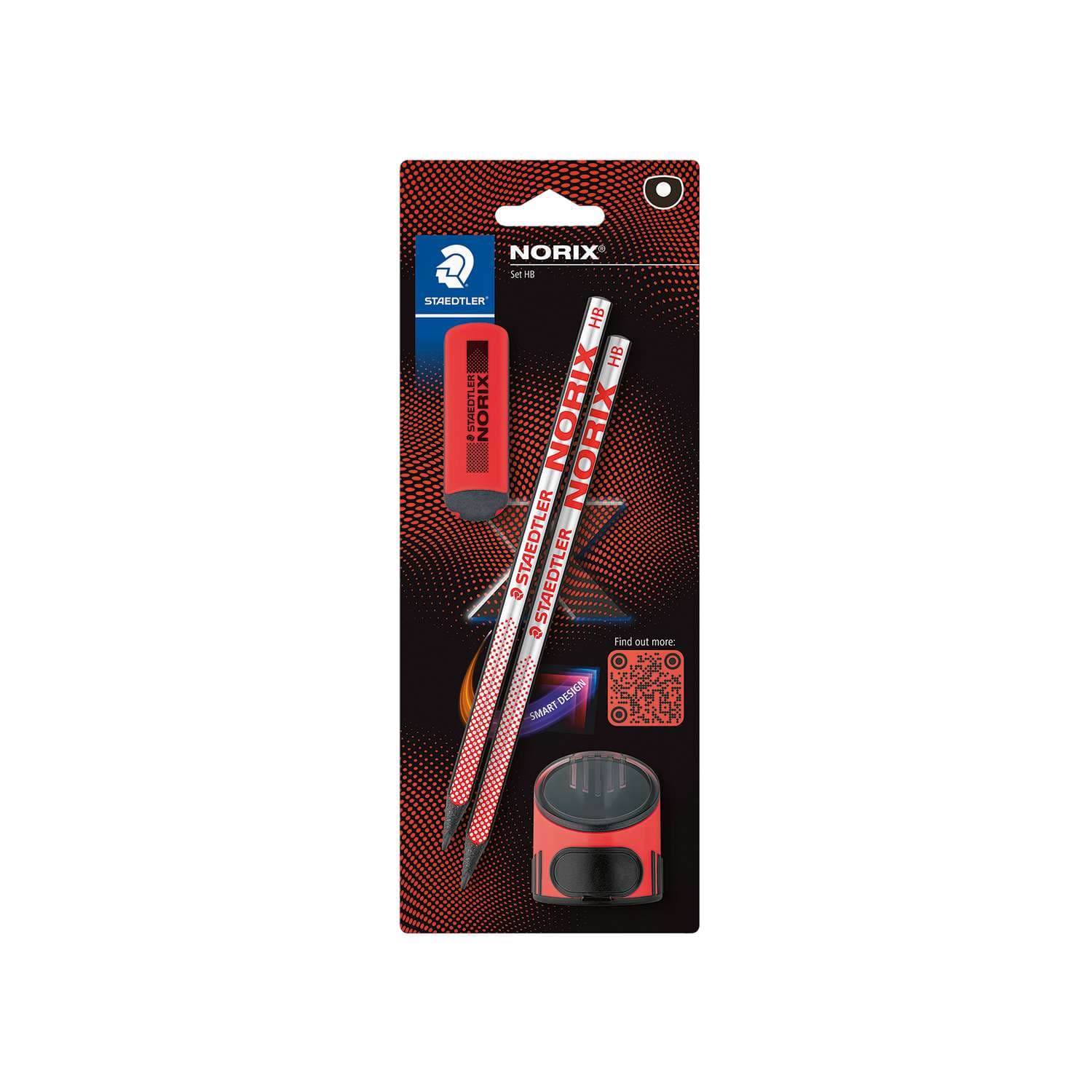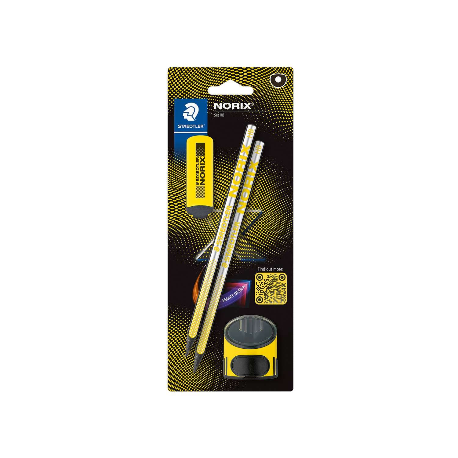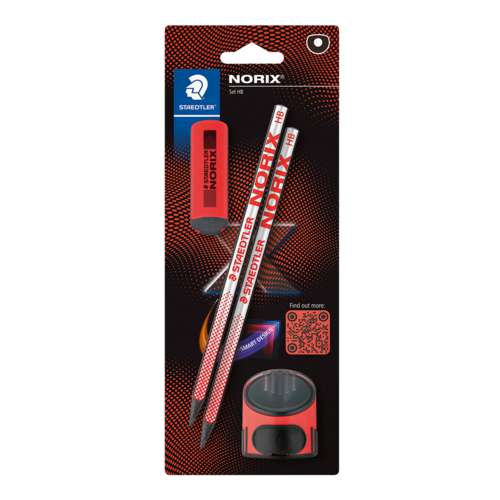 Die STAEDTLER® NORIX® Bleistift-Sets überzeugen durch ihr modernes, ergonomisches Design und nachhaltige Materialien. Jedes Set enthält 2 HB-Bleistifte, 1 Radierer und 1 Einfachspitzer – praktisch verpackt auf einer Blisterkarte.