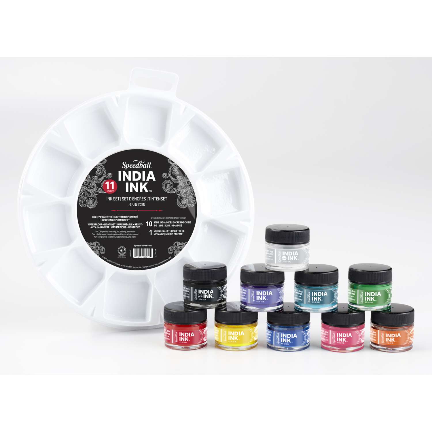 Speedball® INDIA INK™ ist hochpigmentiert, wasserfest und lichtecht. Erhältlich als Set mit 10 x 12-ml-Gläsern + Malpalette.