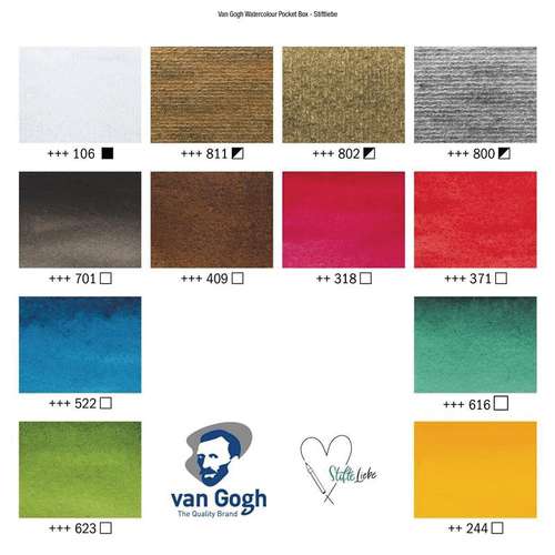 - 12 halbe Näpfchen Van Gogh Aquarellfarbe in 9 Grund- und 3 Metallic-Farbtönen