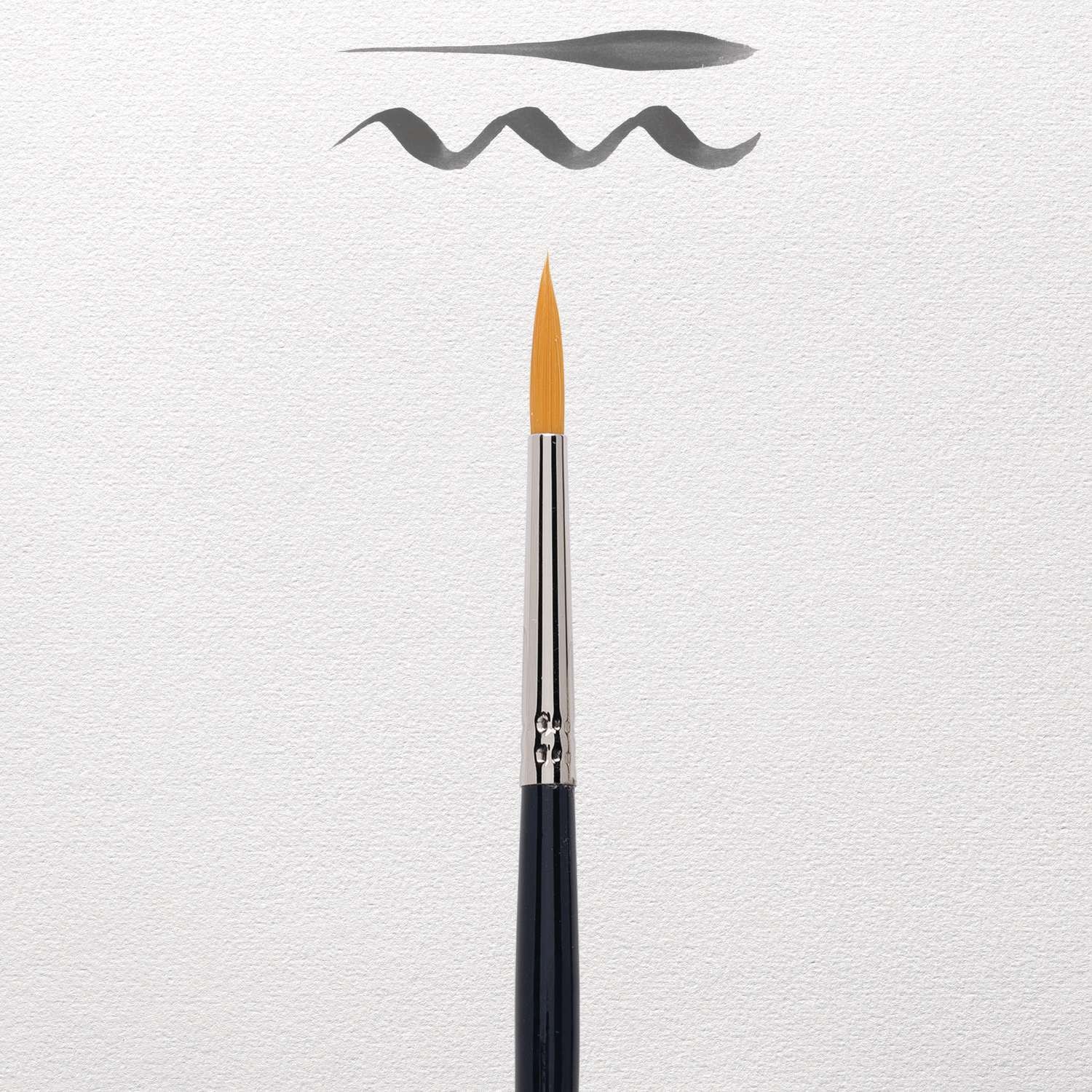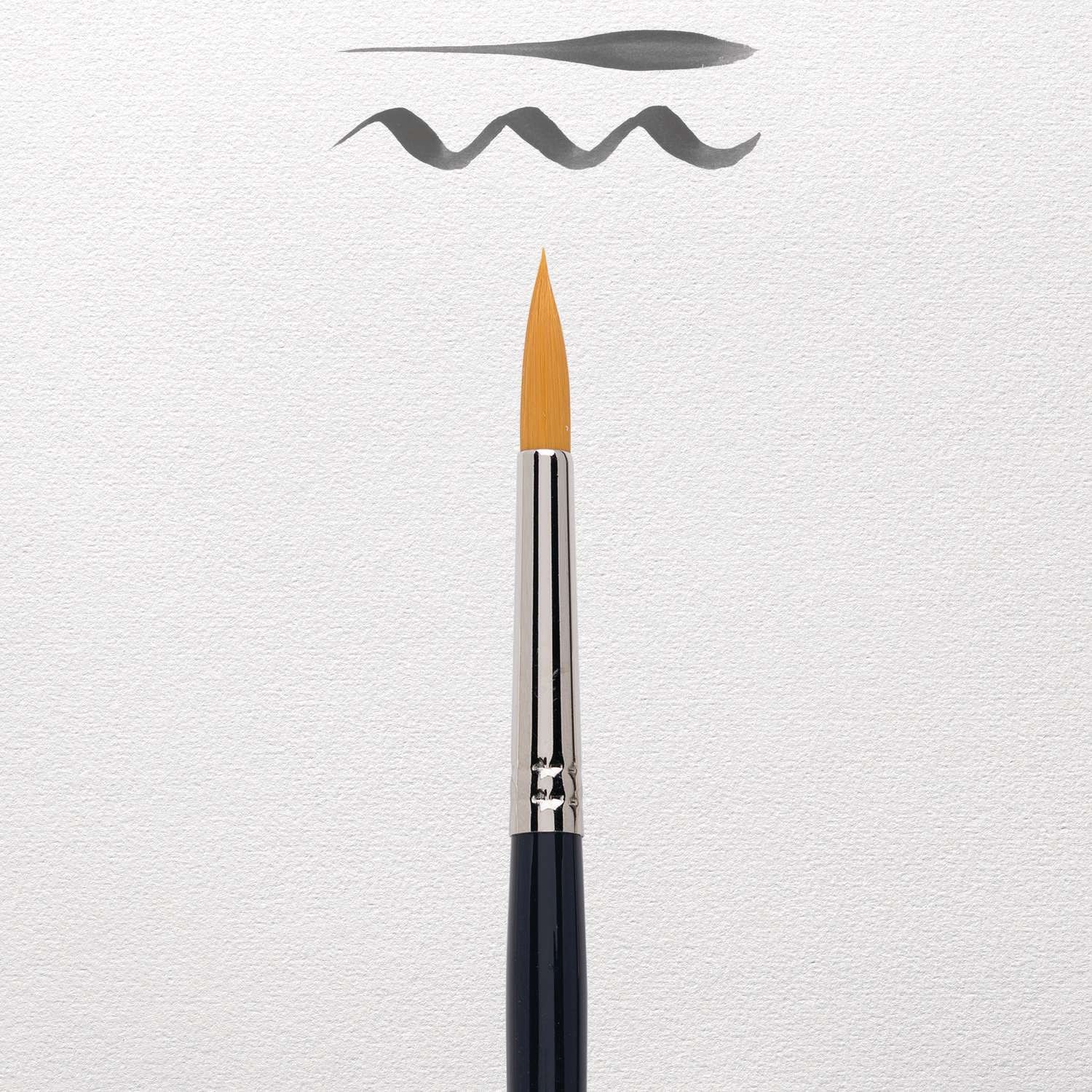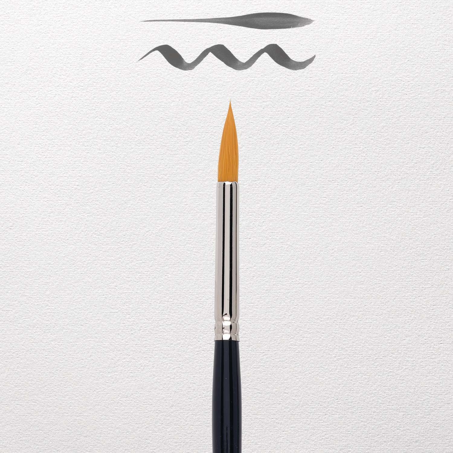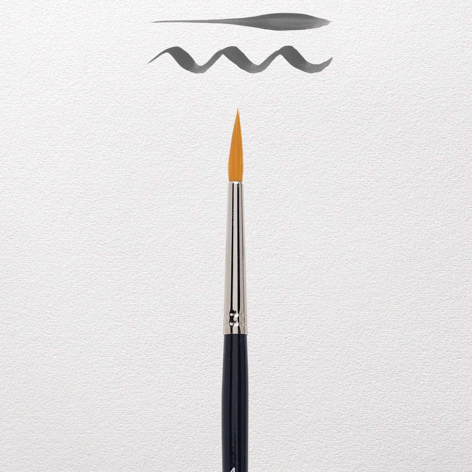 Aquarellpinsel von hervorragender Qualität. Besonders sorgfältig und fachmännisch hergestellt. Haar: goldfarbene Synthetikfasern. Form: rund mit sehr feiner Spitze. Zwinge: runde, nahtlos vernickelte Messingzwinge. Stiel: kurz, glänzend lackiert.
