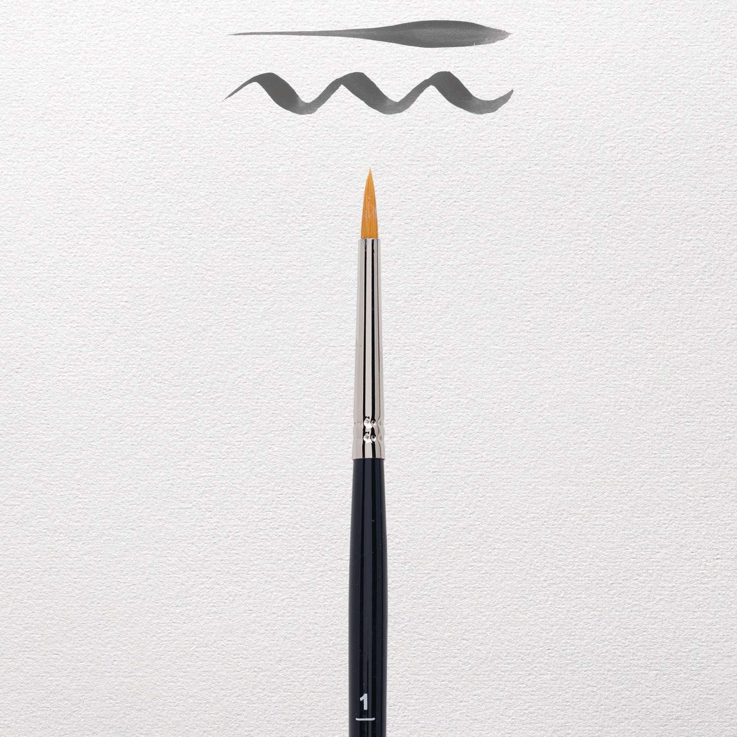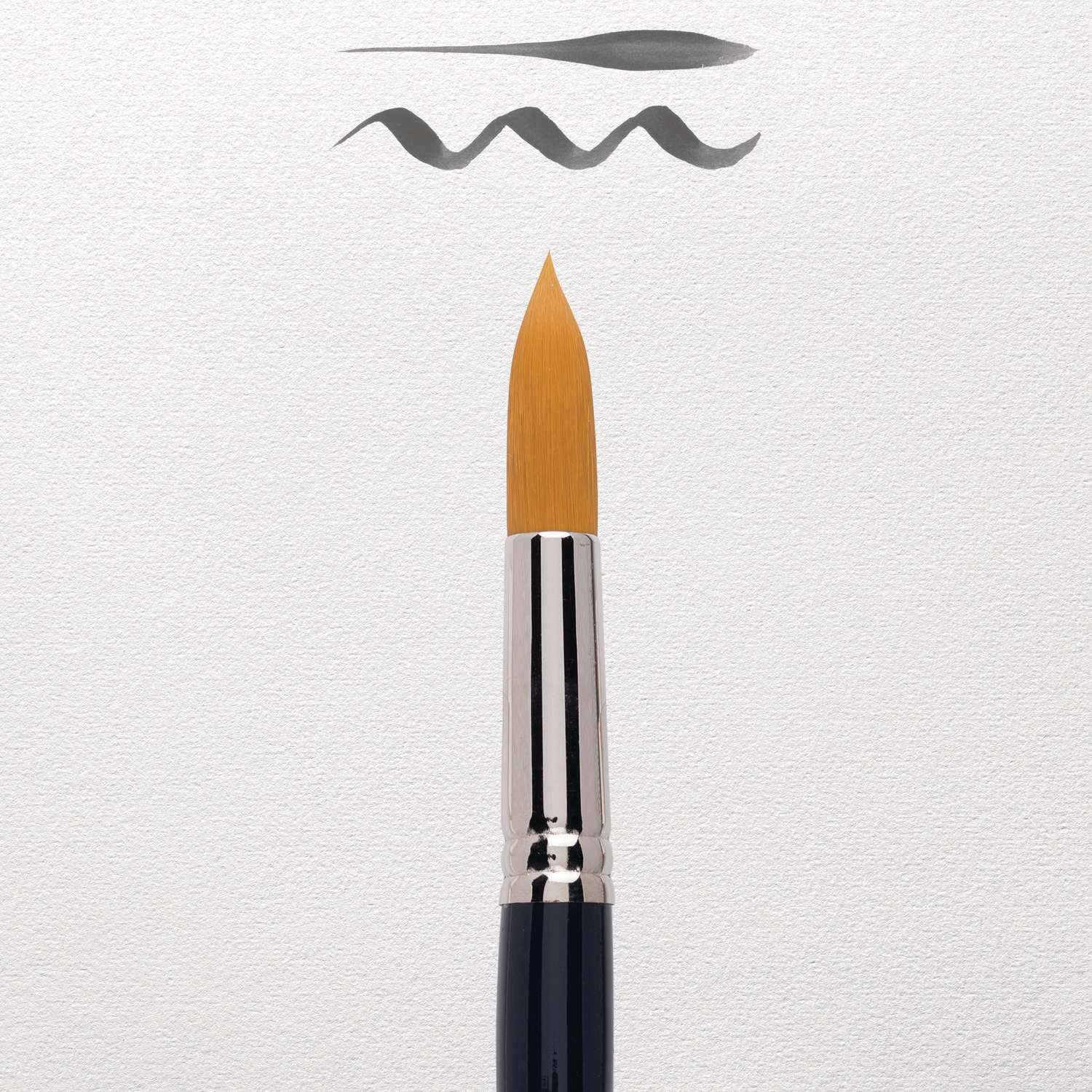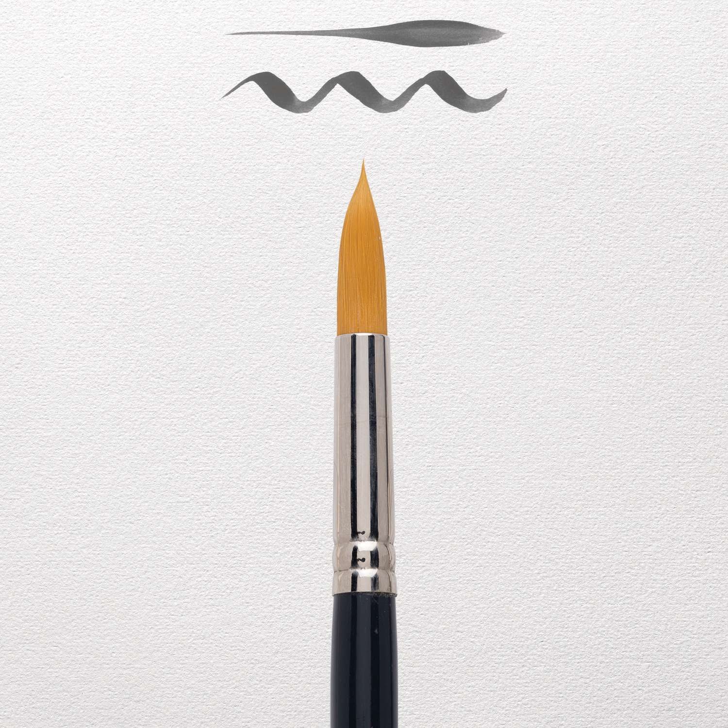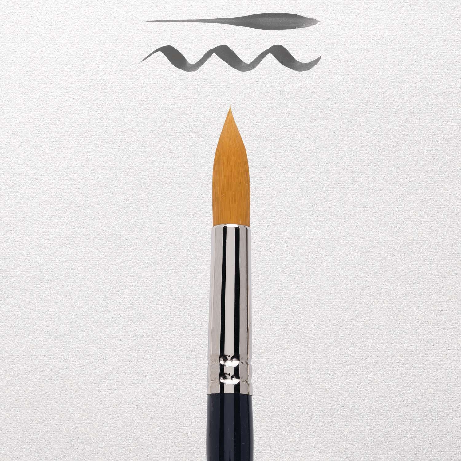Aquarellpinsel von hervorragender Qualität. Besonders sorgfältig und fachmännisch hergestellt. Haar: goldfarbene Synthetikfasern. Form: rund mit sehr feiner Spitze. Zwinge: runde, nahtlos vernickelte Messingzwinge. Stiel: kurz, glänzend lackiert.