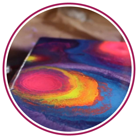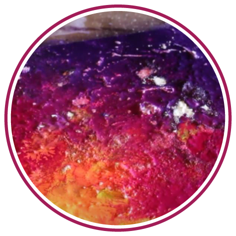 Hier mischen Sie Sprühfarbe mit Tinte und Wasser. Durch die nasse Auftragung erzeugen sich spannende Krakeliereffekte. Arbeiten Sie grosszügig mit Wasser und lassen Sie die Pigmente schwimmen. Mit einem Föhn werden wahlweise noch mehr Strukturen reingebracht.