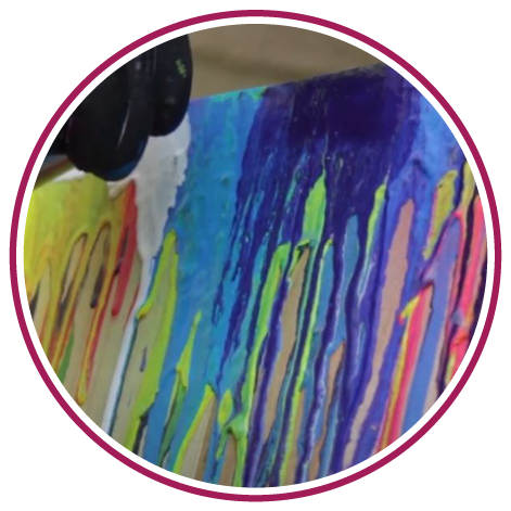 Nun entdecken Sie ein anderes Gestaltungsmedium – und zwar ein Holzbrett. Die Dosen werden nah an das obere Ende des Brettes gehalten und mittels langer Düsenbetätigung viel Farbe auf den Untergrund übertragen. So erzeugen Sie einen Tropf- und Fliesseffekt.