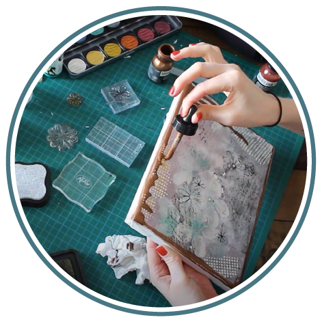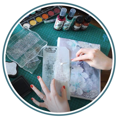 Schablonen, Silikonstempel, Schwämmchen, ev. Sprühfarbe, Schere, Lineal, Haarföhn, Wasser, Fotoausdruck zum Übertragen (Laserdrucker)