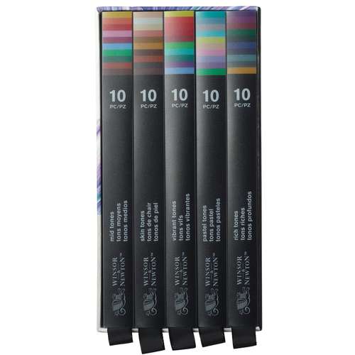 Das WINSOR & NEWTON™ Studio Collection Farbstift-Set begeistert durch seine außergewöhnliche Verpackung: Die edle Box erinnert an eine hochwertige Buchsammlung. Im Inneren verbergen sich 50 Farbstifte, geordnet in fünf Schubladen, die jeweils eine eigene Farbpalette präsentieren.