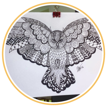 - Nun folgen die berühmten Tangles: diese ziehen sich als Muster durch die entstandenen Flächen und erwecken diese so zum Leben! Denken Sie hier nicht zu fest nach, wie es aussehen soll, sondern lassen Sie Ihre Hand mitsamt dem Stift intuitiv und entspannt fliessen.