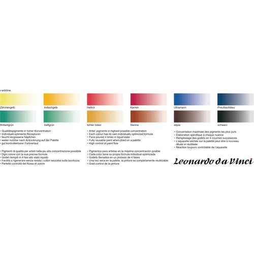 Die hochkonzentrierten Qualitätspigmente der feinen da Vinci Aquarellfarben sorgen für brillante, leuchtende Farben. Individuell optimierte Rezepturen garantieren eine hohe Farbintensität.