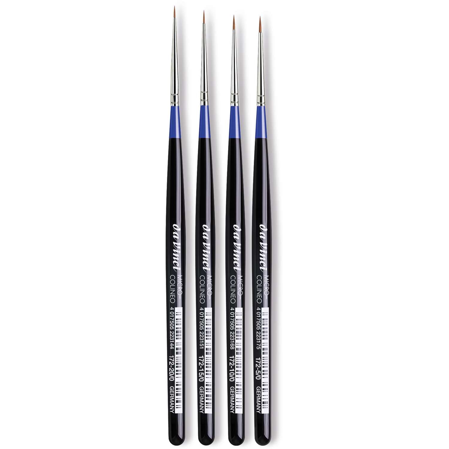 Das da Vinci MICRO-COLINEO Set, Serie 172, wurde speziell für feinste Detailarbeiten und Miniaturmalerei entwickelt. Es enthält vier hochwertige Pinsel mit synthetischen Kolinsky-Fasern, die durch hohe Elastizität, Formstabilität und exakte Spitzen überzeugen. Die kurzen Fasern sind besonders präzise und ermöglichen filigrane Striche, Linien und Details, wie sie in Grafik, Illustration, Modellbau oder bei Miniaturen gefordert sind. Dank der veganen Fasern bieten die Pinsel eine tierfreie Alternative zu Kolinsky-Rotmarderhaaren. Die Stiele sind kurz, handlich und für maximale Kontrolle ausgelegt. Ein ideales Set für Profikünstler, Studenten und Hobbykünstler, die präzise Ergebnisse erzielen möchten.