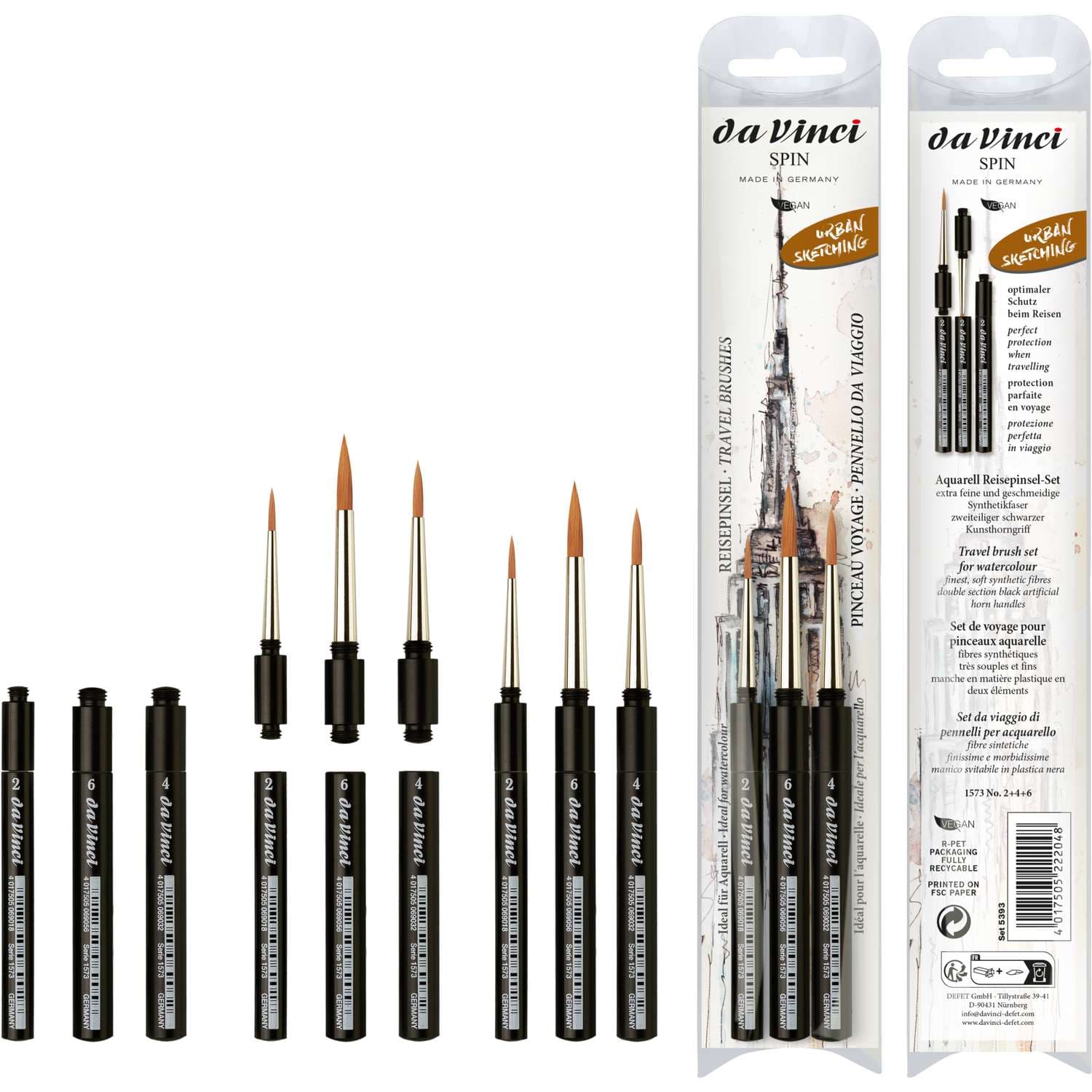 Das da Vinci SPIN Reisepinsel-Set bietet 3 hochwertige Aquarellpinsel der beliebten SPIN-Serie (1573 in den Größen 2, 4 und 6). Die Pinsel überzeugen durch ihre kompakte Form und exzellente Malqualität.