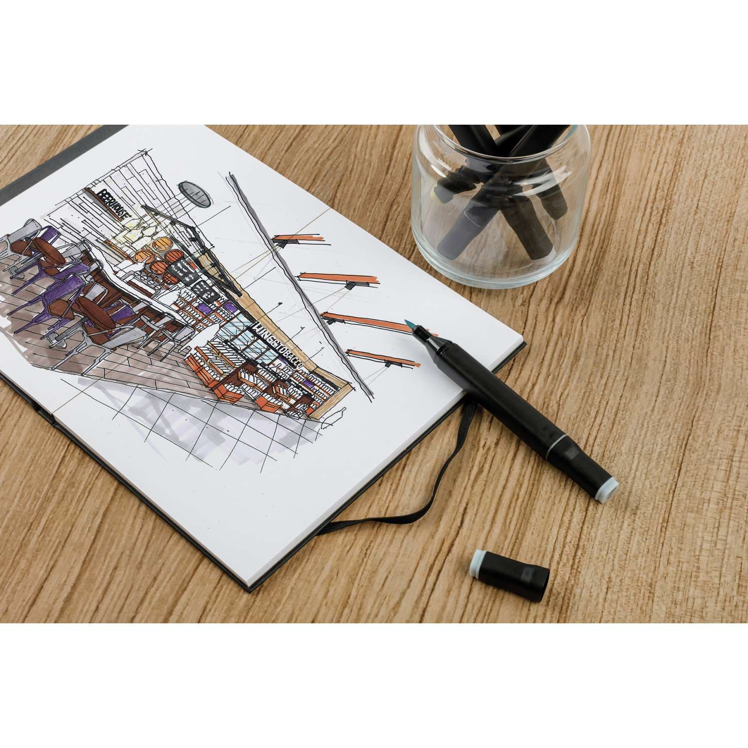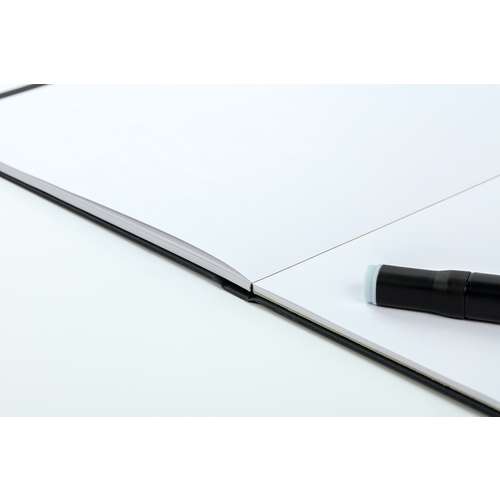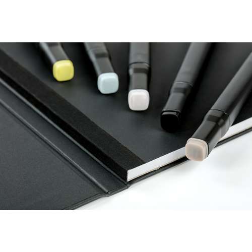 Couverture noire rigide et s’ouvre parfaitement à plat grâce à sa reliure suisse pour un plus grand confort d’utilisation. Sa protection Layout double-face permet de réaliser des mélanges et dégradés de couleurs sur le recto et le verso du papier, sans craindre que l’encre ne transperce.