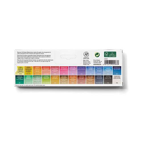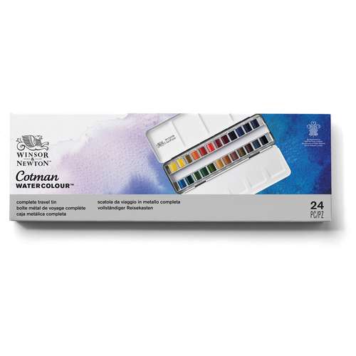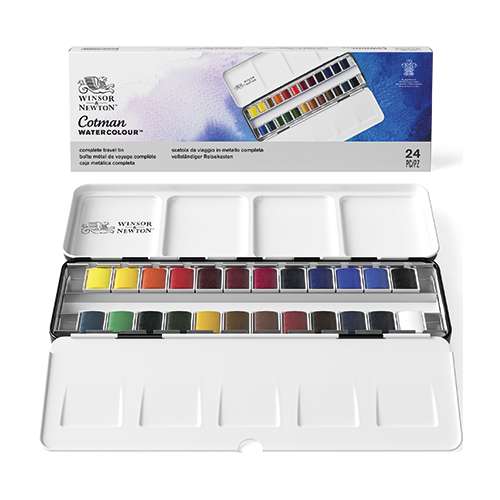 24 1/2 godets d'aquarelle Cotman Sketchers dans ce coffret en métal très pratique avec couvercle palette et encoche pour le pouce assurant une parfaite prise en main.