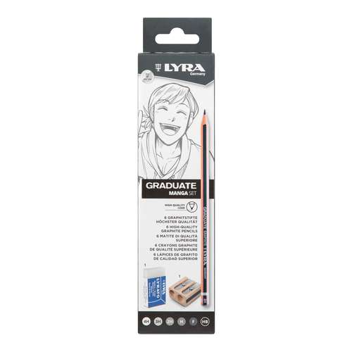 Le set Manga Graduate Lyra contient 6 crayons graphite de haute qualité avec différentes duretés, ainsi qu'un taille-crayon double et une gomme LYRATO.