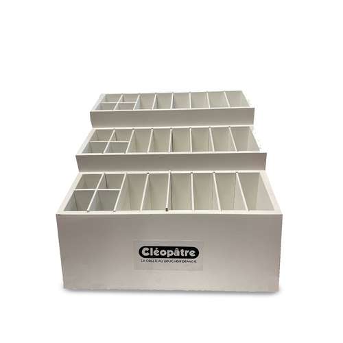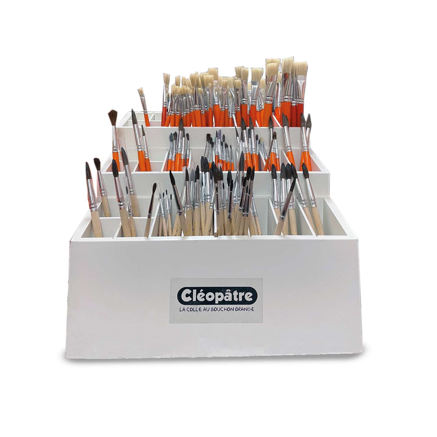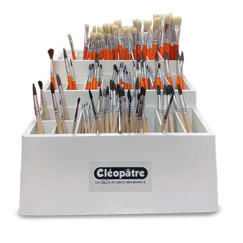 Le présentoir à pinceaux en bois Cléopâtre® est fabriqué en bois robuste et présenté dans un coloris blanc neutre. Avec ses 24 compartiments, il permet une organisation claire des pinceaux par taille et forme.
