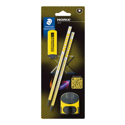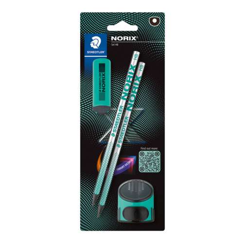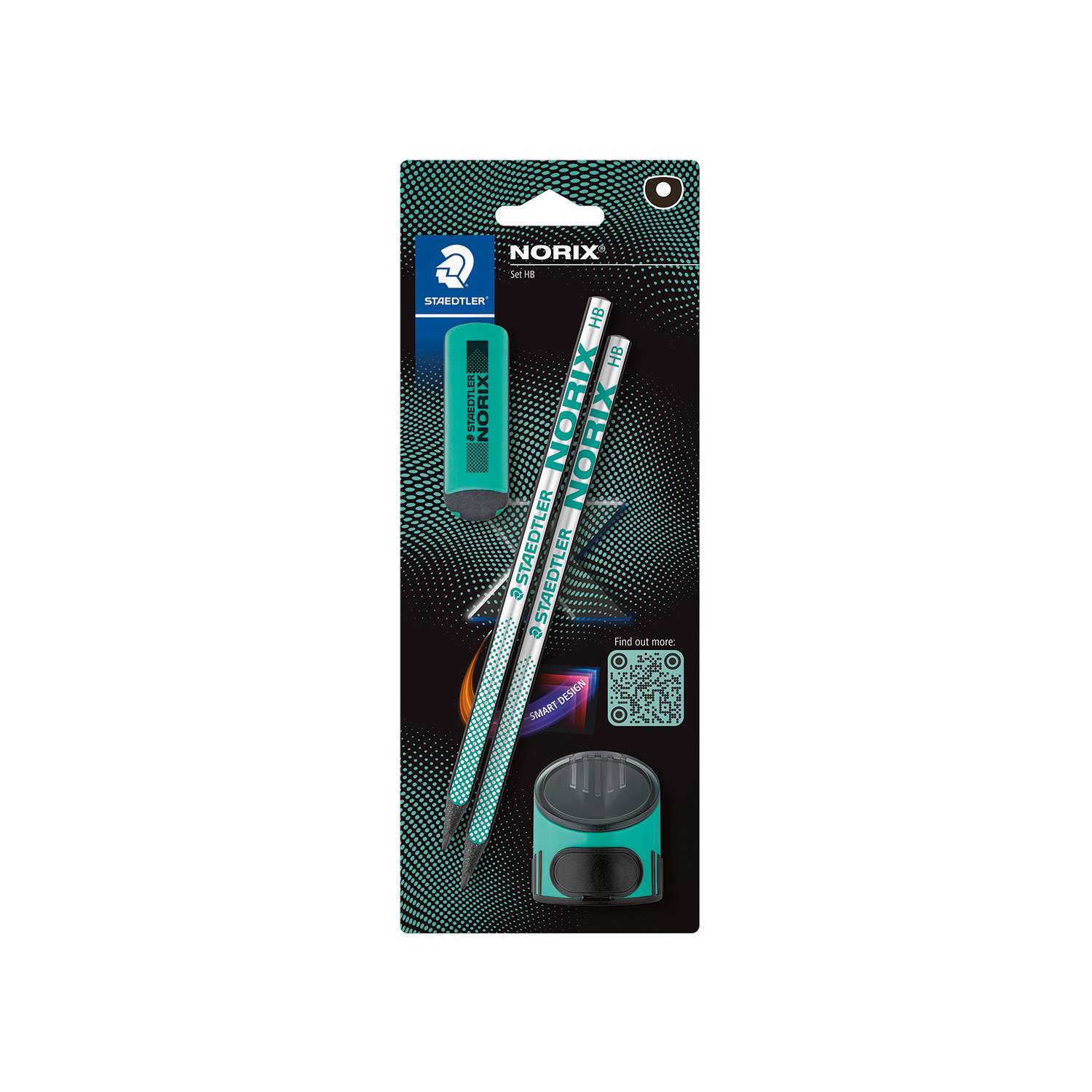 Les sets esquisse Norix® Staedtler® se distinguent par leur design moderne, leur ergonomie optimale et l’utilisation de matériaux durables. Chaque set contient 2 crayons graphite HB, 1 gomme et 1 taille-crayon, présentés dans un packaging blister pratique.