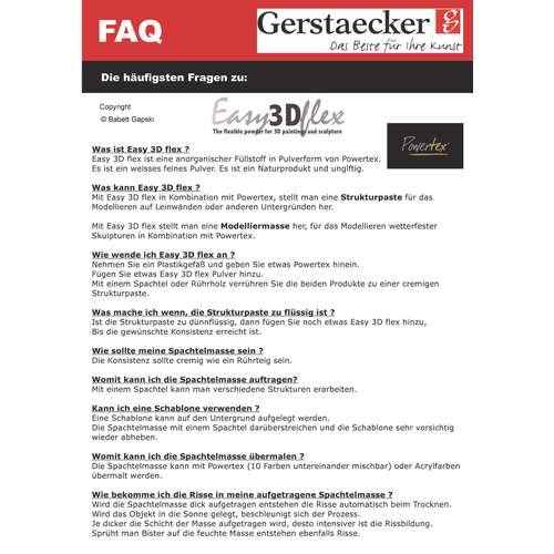 Easy 3D flex est un composé non organique présenté sous forme de poudre. Mélangé à du Powertex, vous pouvez l’utiliser pour faire des textures épaisses et grossière et même atteindre un effet 3D dans vos tableaux et sculptures. Easy 3D flex et Powertex doivent être mélangés avec un racloir ou une spatule et peuvent être appliqués avec une brosse, un racloir, une spatule ou sculptés à la main. Nous recommandons de ce fait le port de gants ou l’utilisation d’une crème pour les mains.