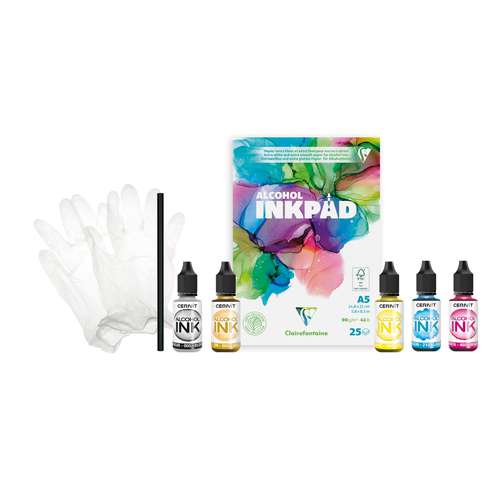 En collaboration avec Cernit, ce coffret regroupe tout le matériel nécessaire pour s’initier aux encres à alcool.