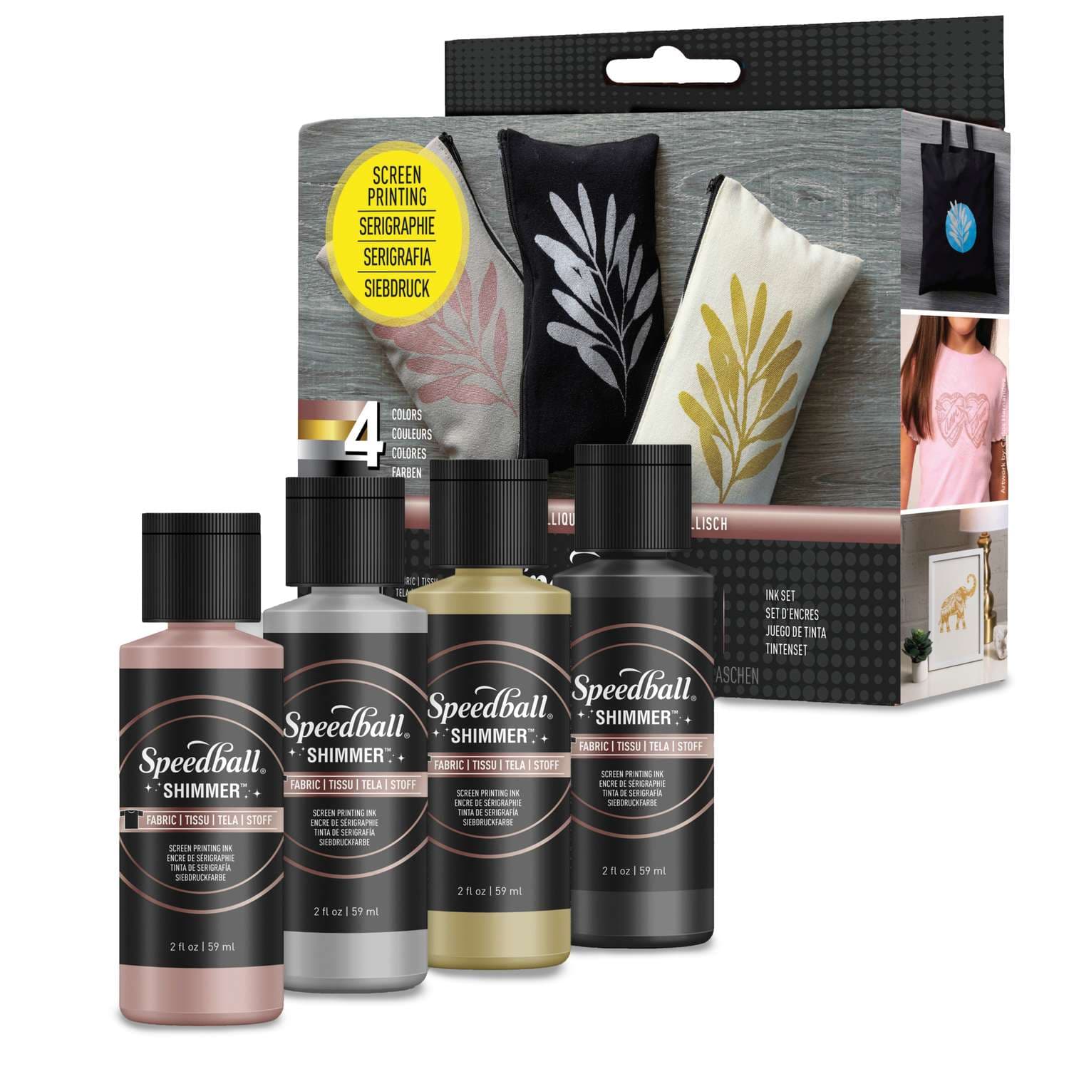 Le set encre sérigraphique effet métal Speedball comprend quatre encres de sérigraphie textile scintillantes, idéales pour apporter un effet métallisé élégant et lumineux à vos créations sur tissu. Les teintes Black Pearl, Argent, Or et Or rosé se distinguent par leur brillance intense et sont parfaites pour des impressions créatives sur coton, lin, denim et toile (canvas).