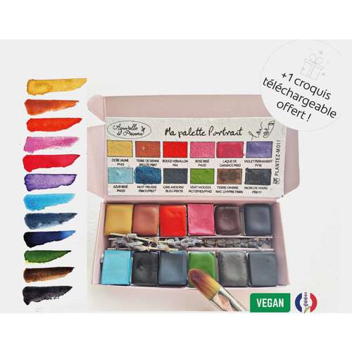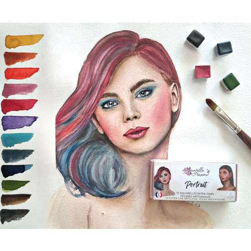 Palette de 12 demi-godets Aquarelle de Provence aux superbes couleurs pour les portraits aquarelle, nées de la collaboration avec l'artiste portraitiste Laurine Bazet. Plus
