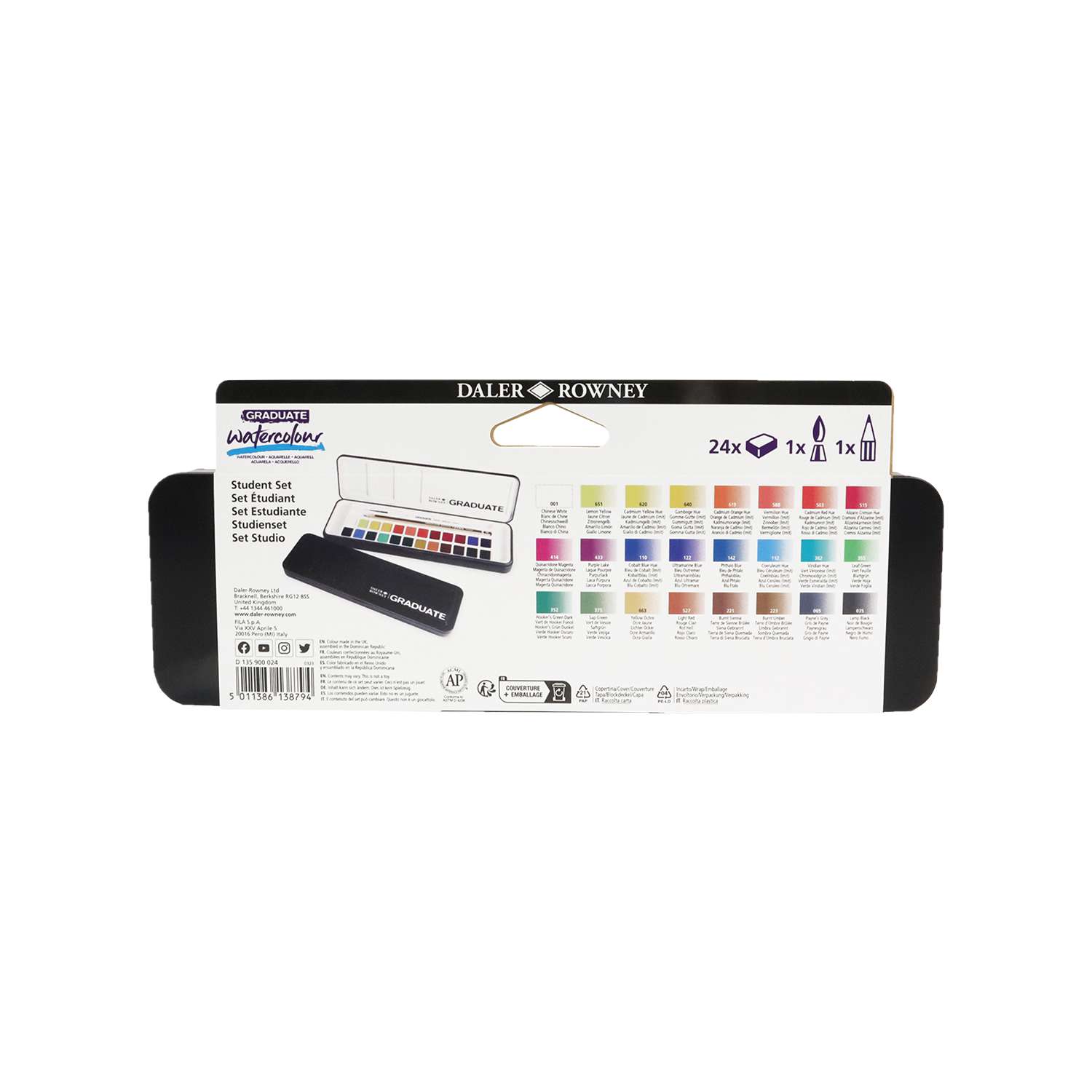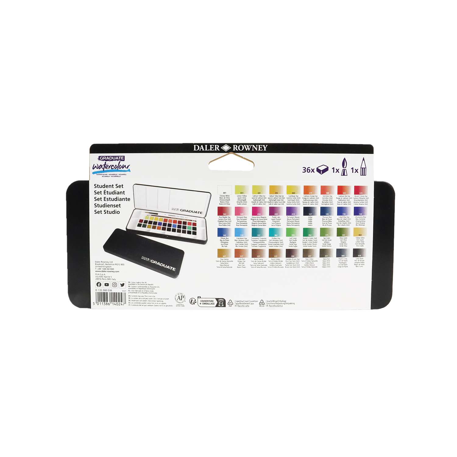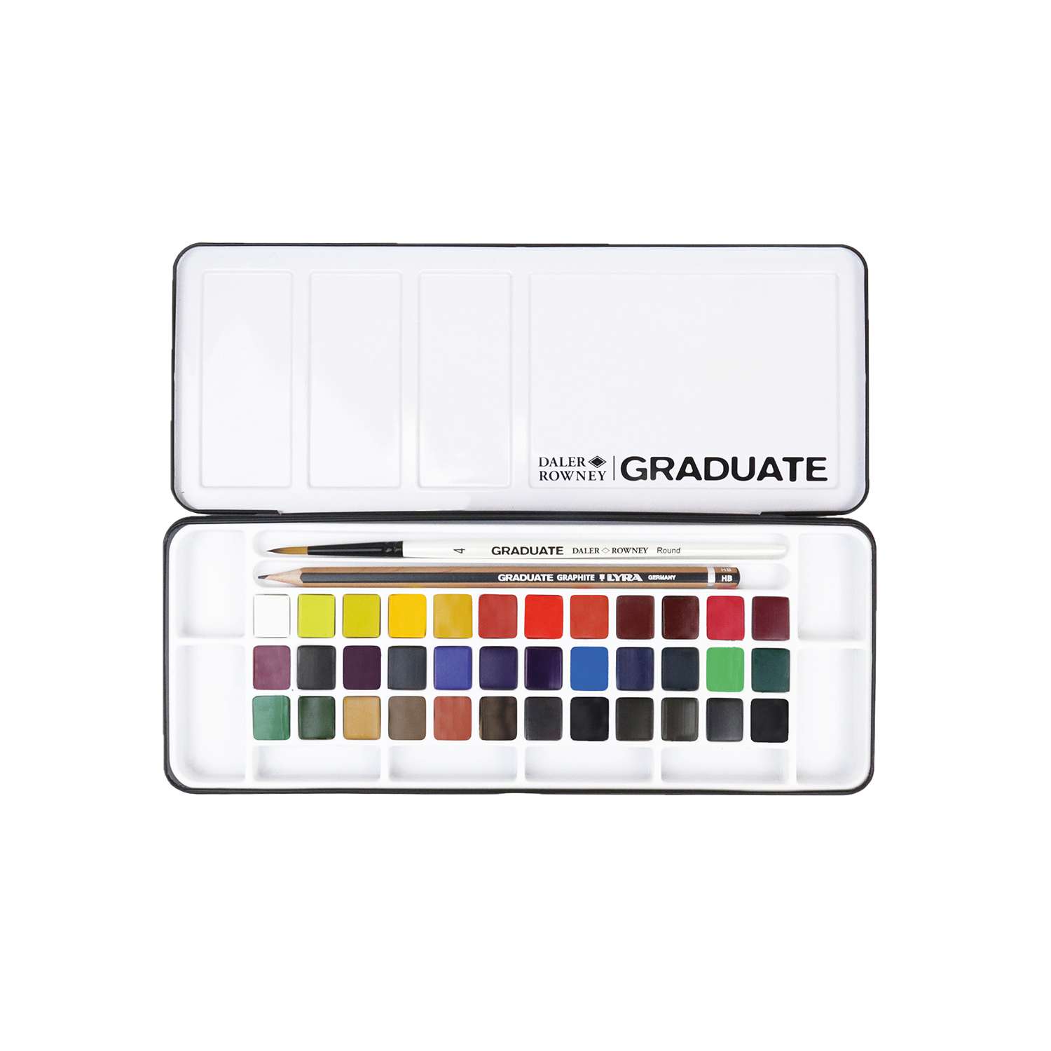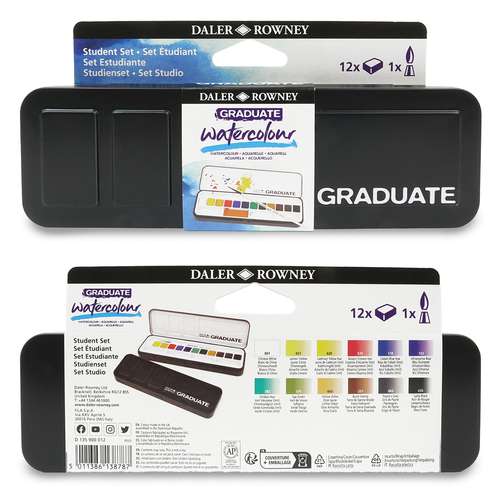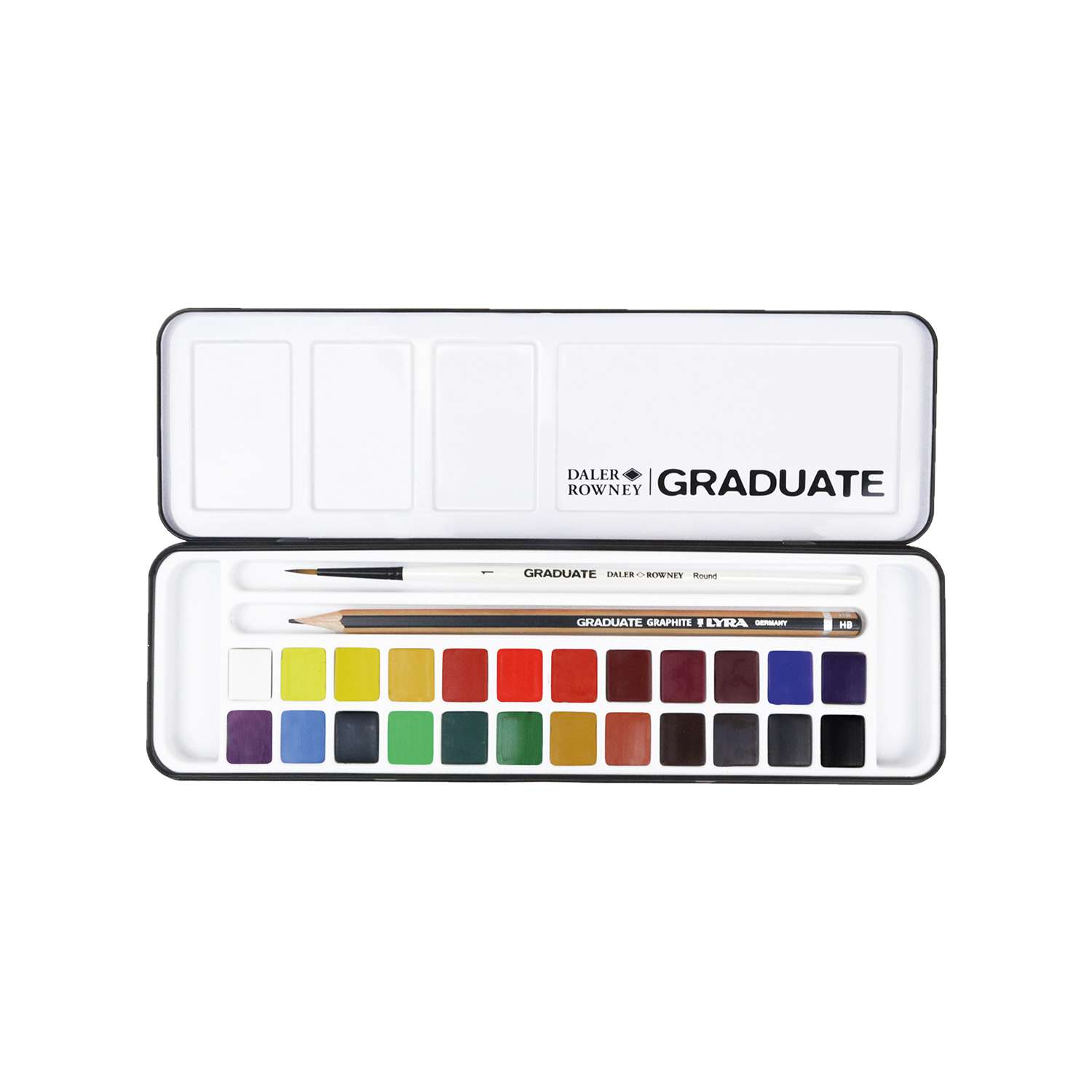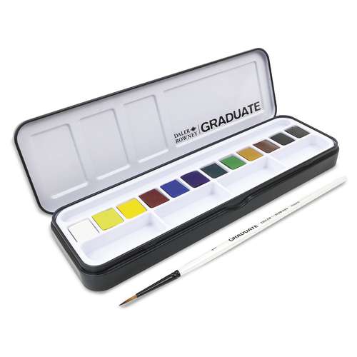 Coffrets Daler‑Rowney Graduate eau-forte : 12, 24 ou 36 demi-godets + pinceaux et crayon. Couleurs brillantes, résistantes, boîte métal pratique. Plus