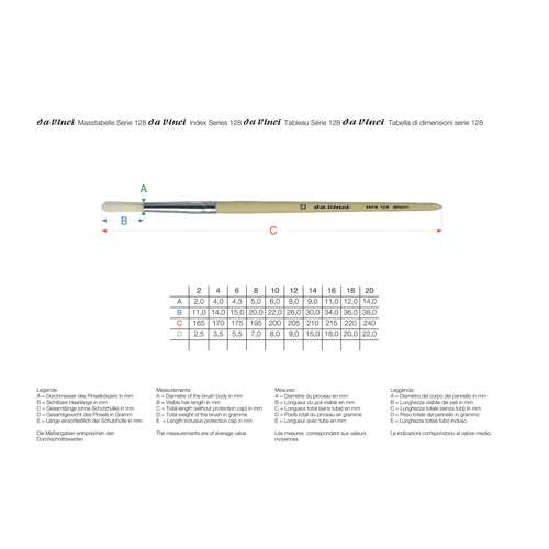 Brosse ronde DA VINCI, série 128 pour le cours de peinture. Soies blanches de Chine, virole en aluminium, manche court en bois brut. Différentes tailles au choix.Prix par brosse.