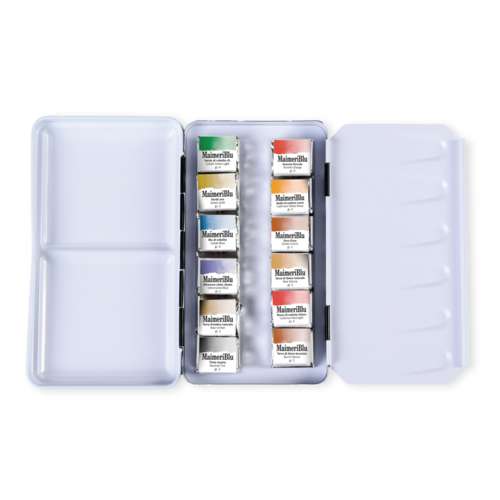 Disponible en boîte en métal de 12 demi-godets d´aquarelles MaimeriBlu.