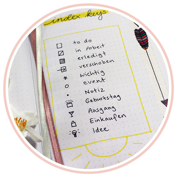 Welche Symbole Sie verwenden bleibt dabei ganz Ihnen überlassen. Zeichenfreudige Journaler nutzen den Rest der Legenden-Seite gerne, um im Notizbuch ihrer Kreativität das erste Mal freien Lauf zu lassen.