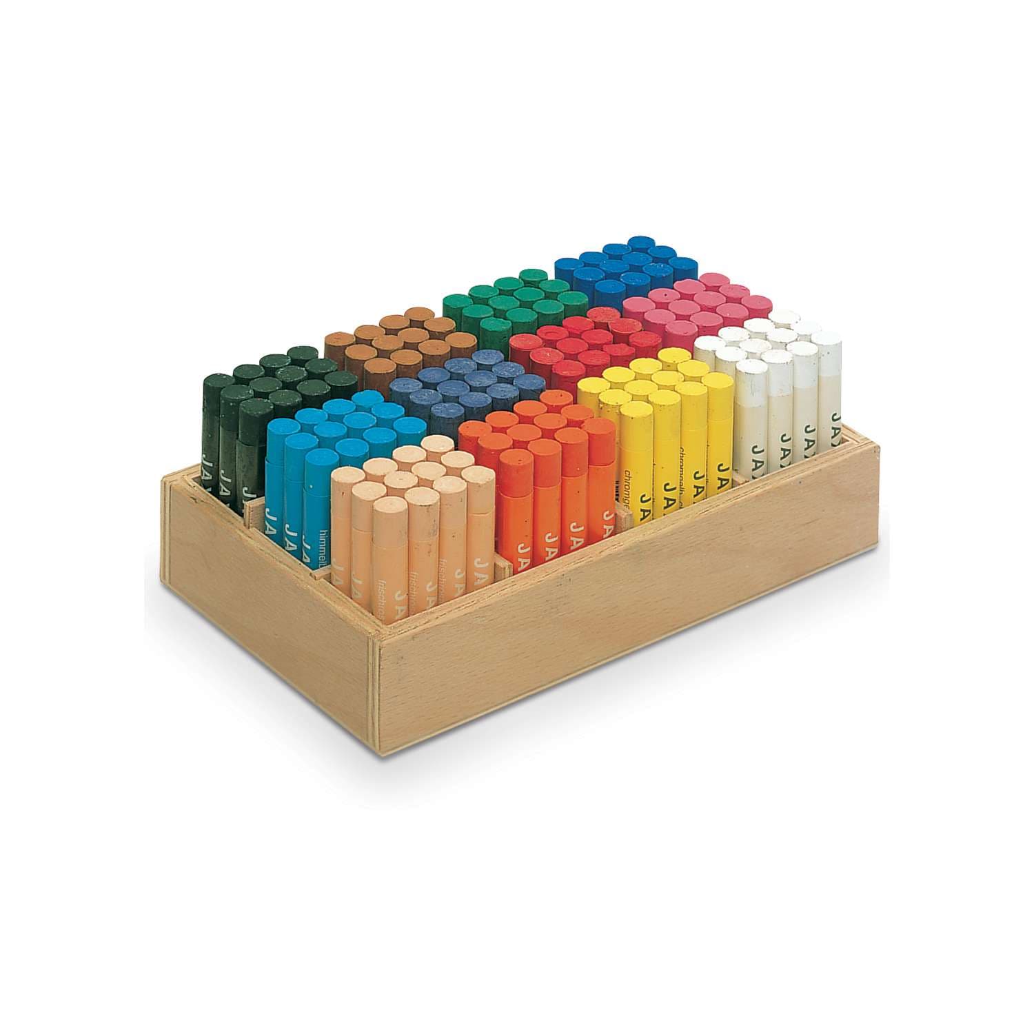 144 pastels à l'huile JAXON livrés dans une caissette en bois, pratique, idéale pour les écoles et les groupes thérapeutiques. La caissette contient 12 x 12 pastels dans les couleurs les plus courantes.