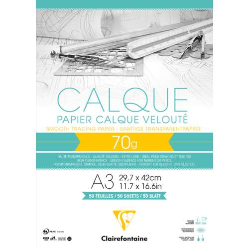 Le papier calque velouté Clairefontaine est idéal pour les dessins au crayon graphite, crayon de couleur, feutre, marqueur, stylo ou encre. Conçu pour les artistes, les ingénieurs, les illustrateurs, les dessinateurs, ce produit est également utilisé par les écoles et les particuliers.