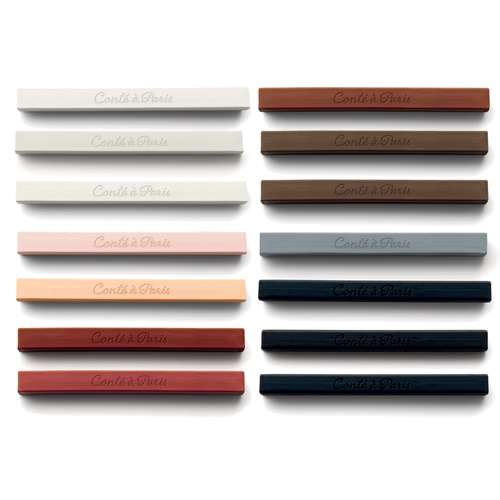 La gamme de carrés esquisse Conté À PARIS™ est composée de nuances sanguines, de gris, de bistre, avec en plus 3 degrés de blancs et de noir.