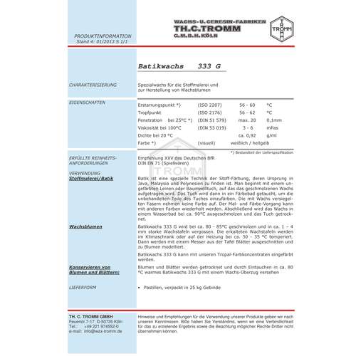 En forme de pastille, cette cire pour batik est facilement dosable, il est possible de la faire fondre et de la travailler facilement à l´aide de l´appareil "tixor malam”. Conseil: si vous souhaitez un effet de craquelé, il suffit ”d´effrayer” le tissu recouvert de cire en le plongeant dans l´eau froide et de le presser, de façon à ce que la cire craque. La cire pour batik se compose de 80% de paraffine et de 20% de cire microcristalline. Disponible en paquet de 1 kg.