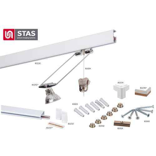 Ce nouveau système Cliprail 2 Hang & Light vous permettra à la fois d´exposer vos oeuvres et de les éclairer de manière fonctionnelle. Le Cliprail 2 se compose d´un rail en aluminium ouvert sur le côté, que vous pourrez fixer aisément sur clip d´attache (voir photo). Hauteur maximum d´installation : 2,80 m. L´ouverture latérale permet de glisser un câble d´alimentation, qui sera parfaitement invisible, relié à un transformateur 12 V. Les armatures du spot halogène peuvent être installées dans la partie inférieure du rail, à côté du crochet de suspension. Les barres sont réglables à votre guise à l´aide d´une clé hexagonale. Vous pouvez accrocher un tableau pesant jusqu´à 45 kg sur le Cliprail 2. Disponible en blanc ou argenté. Rail de 2 m.