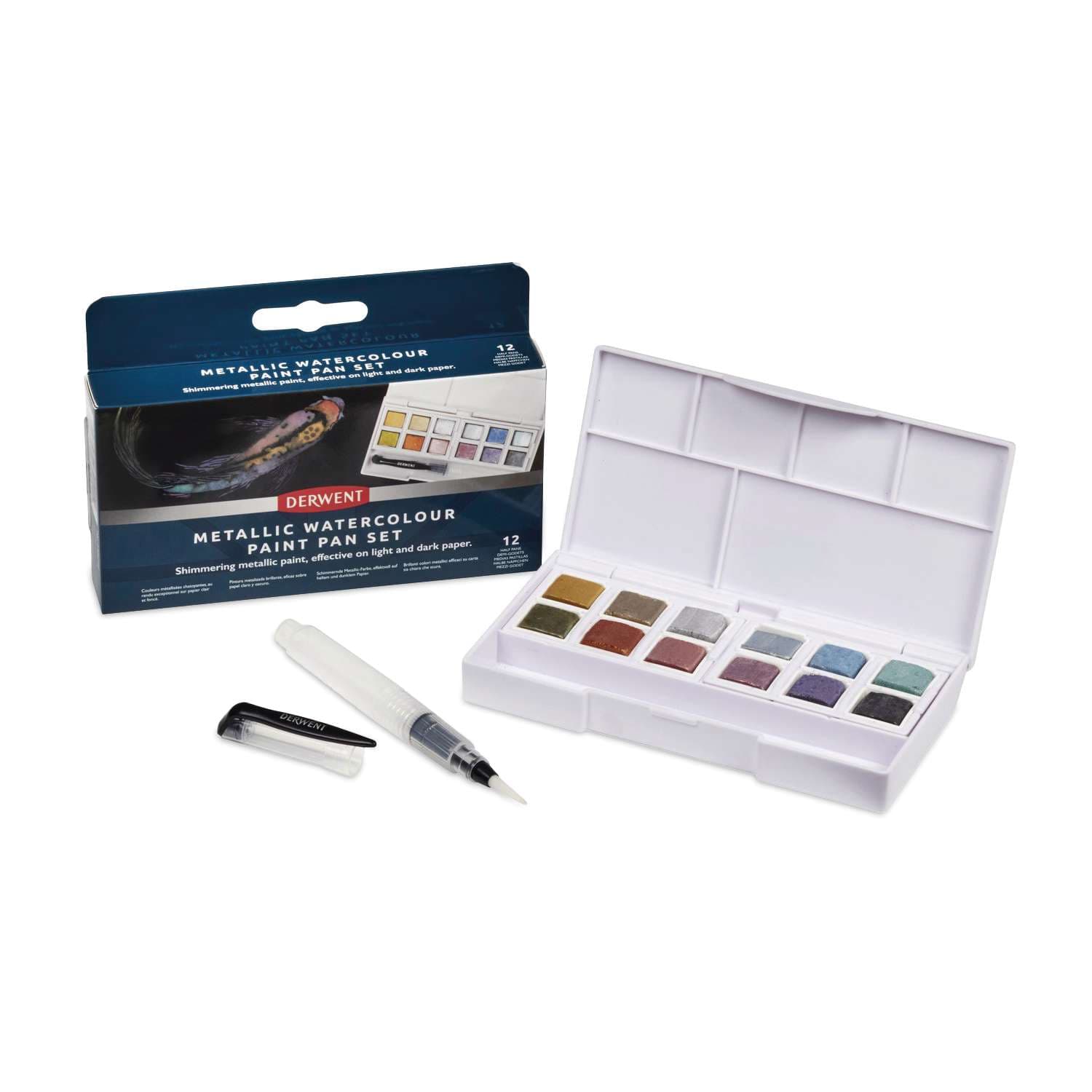 Coffret 12 1/2 godet aquarelle nuances métalliques Derwent, 12 1/2 godets, nuances métalliques