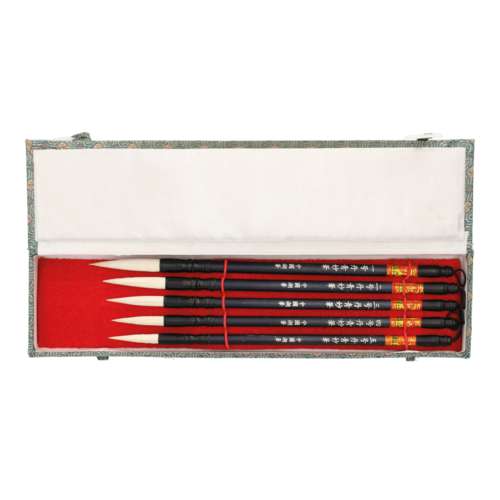 Ce coffret contient 5 pinceaux de Chine à pointes en poils de chèvre montés sur un manche en corne.